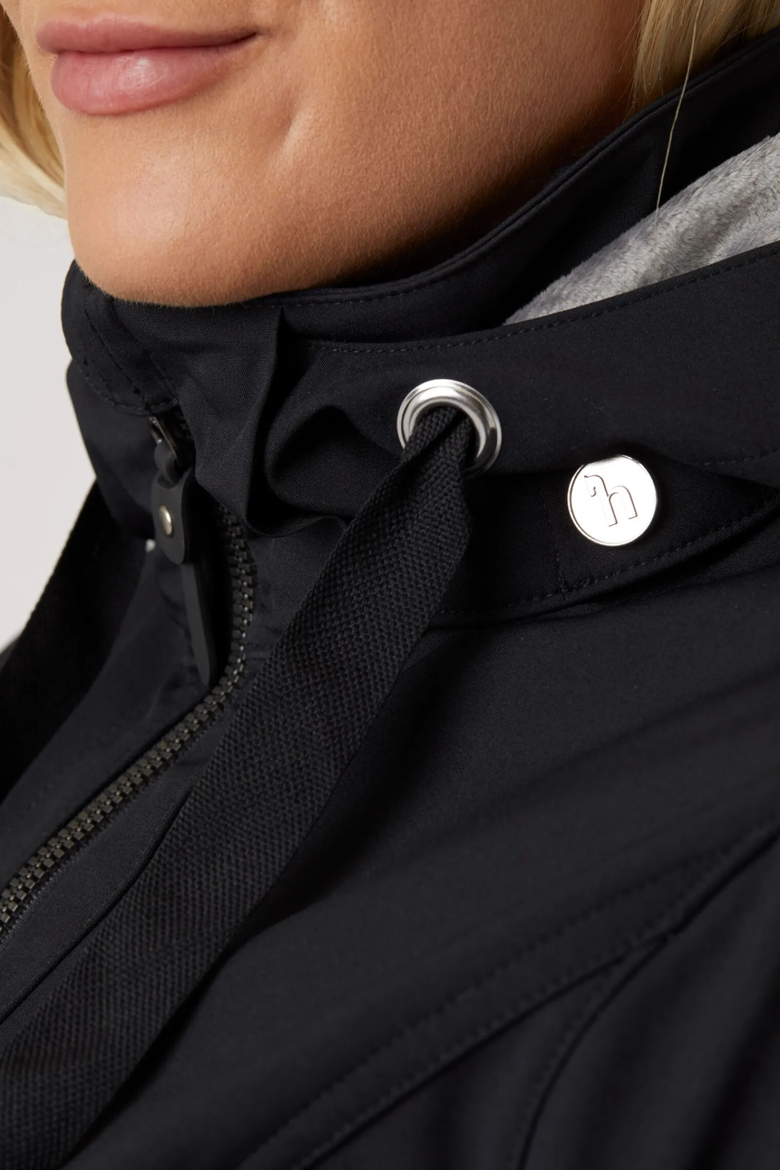 Mykt fleecefôr gjør denne komfortable, lange softshelljakken til et utmerket valg. Med denne flotte jakken holder du deg ikke bare varm, men du har også et stilig plagg i garderoben din slik at du alltid har den perfekte jakken å bruke på kalde vinterdager. En splitt bak gjør at du kan dekke salen uten at det påvirker ridningen din. Justeres i livet med stropper og trykknapper for å gi en god passform. Sidelommene og toveis glidelås forsterker det rene utseendet.