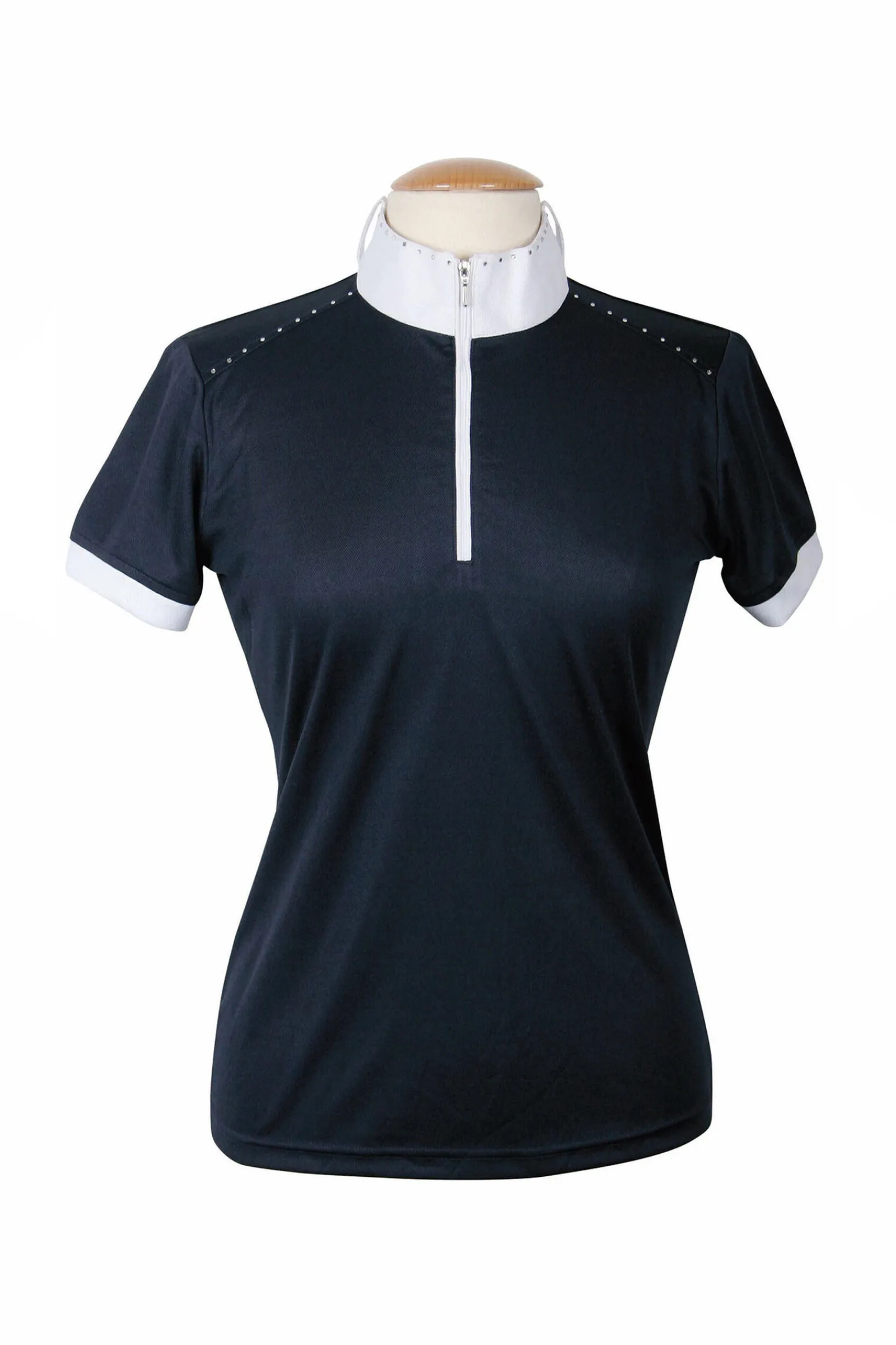 Luksuriøs stevneskjorte med strasskrystaller, glidelås og stående krage med slipshemper.