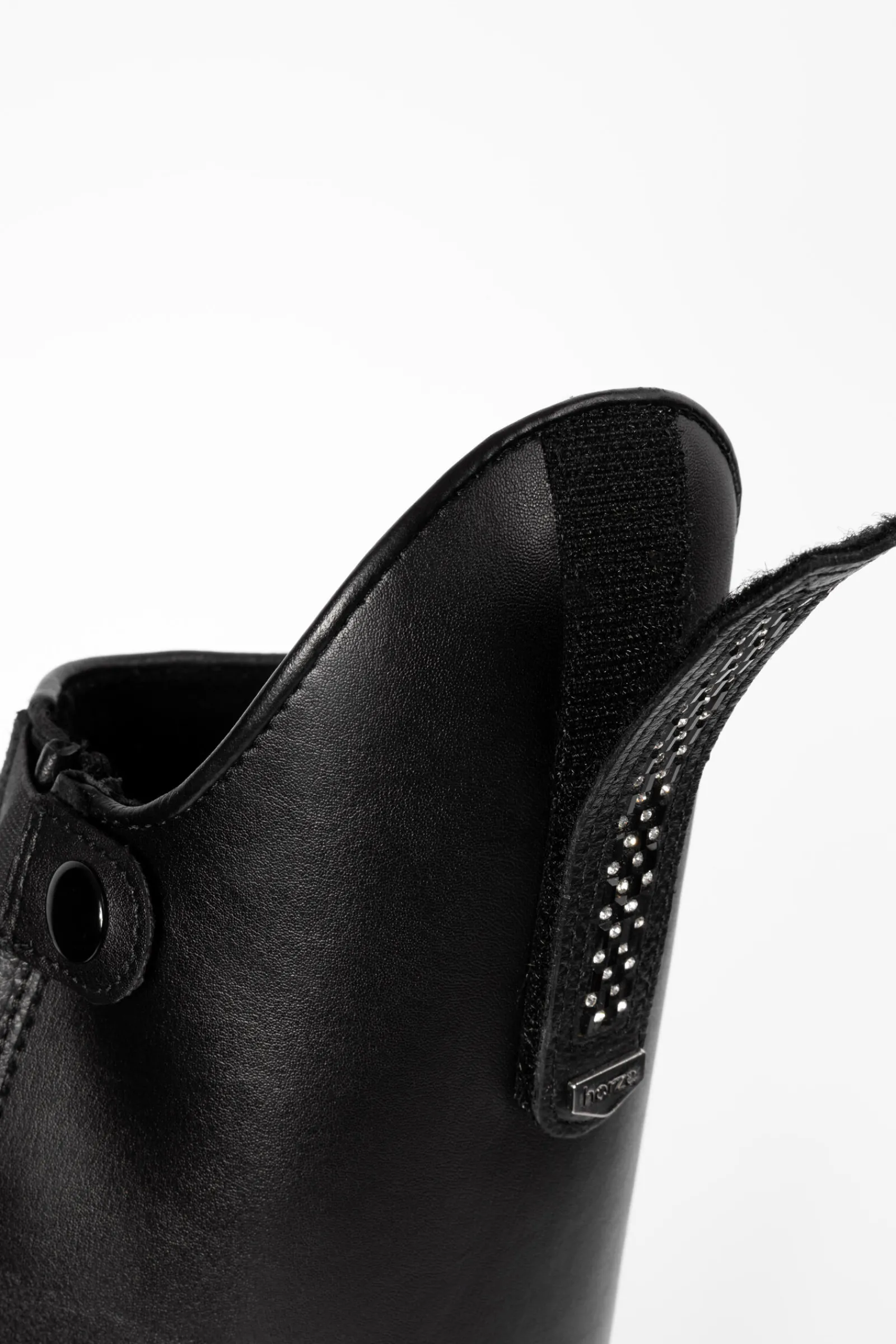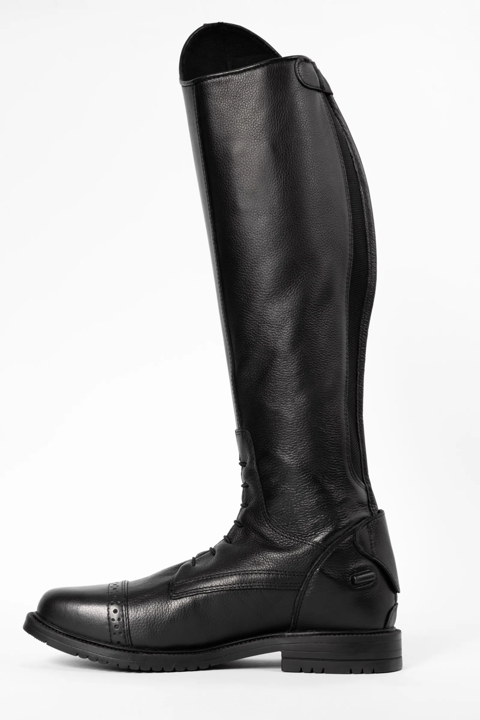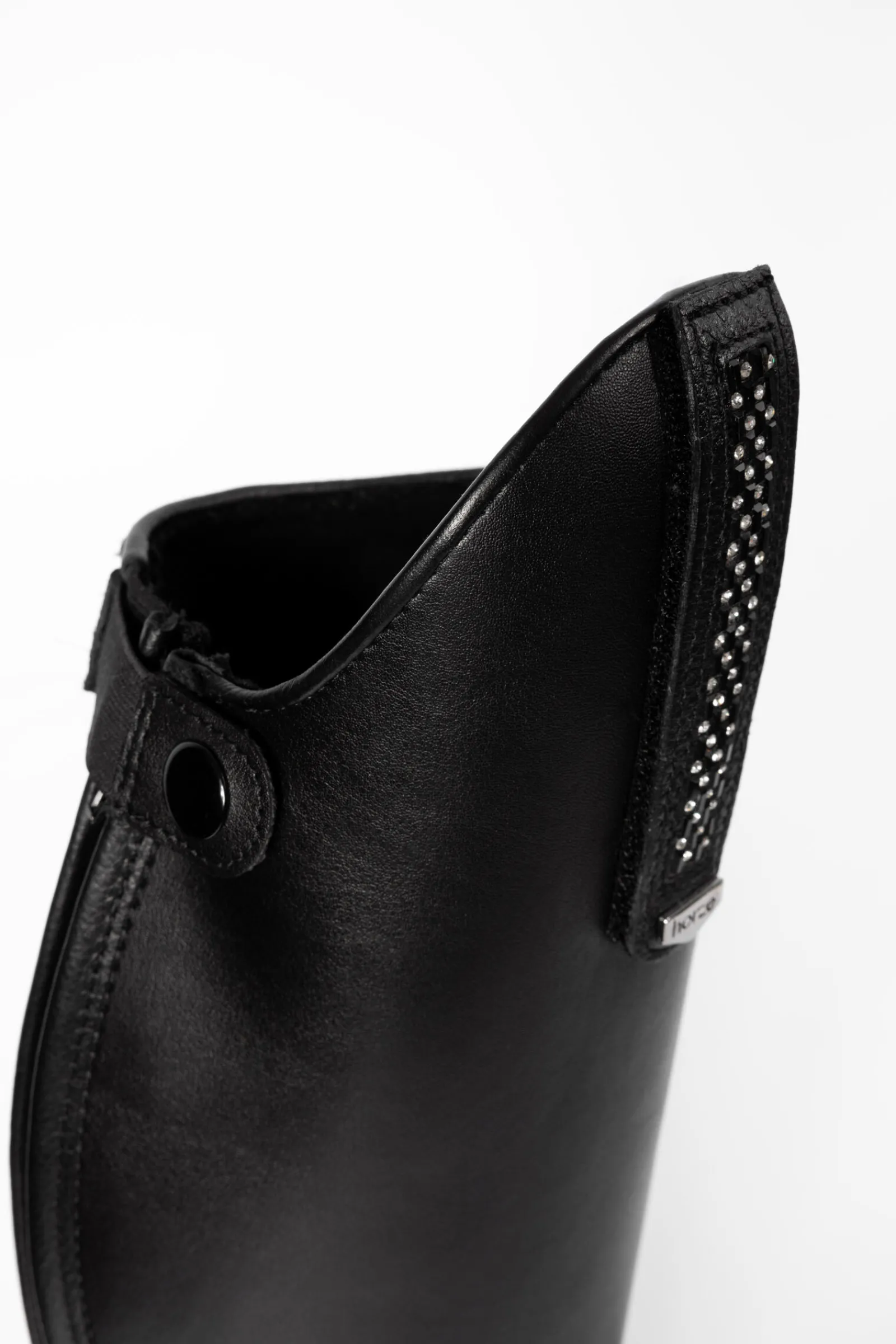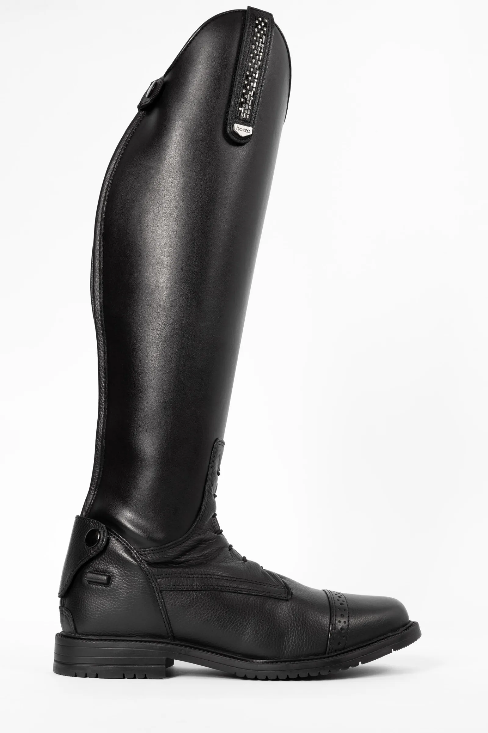 Vår Verona ridestøvler er både elegante og praktiske – perfekt for stevner når du trenger å ta deg best mulig ut. Begge de avtakbare kantene kommer med en liten sølvnål med Horze-logoen. Kombinert mykt lær på utsiden, og et preget område med lær på innsiden for en svært profesjonell ridestøvel. Det elastiske panelet som er langs hele høyden gir en tett passform. Foten har stemplede detaljer, fikserte elastiske lisser og praktiske støtter til sporene. En lærstropp med trykknapp på toppen og bunnen av glidelåsen sikrer at den ikke åpner seg.