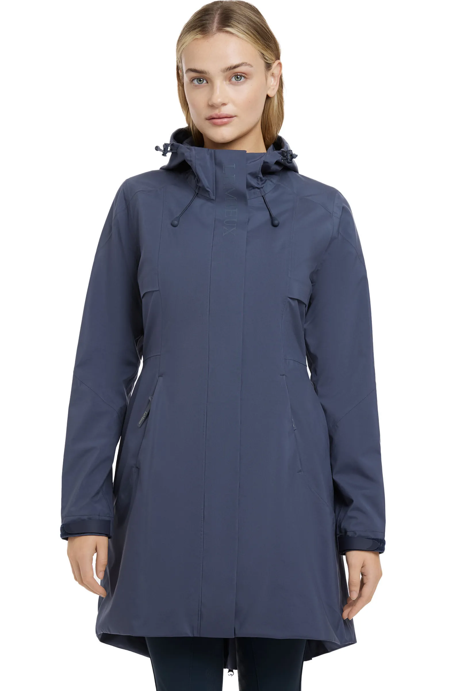 LeMieux Grace lang regnjakke for dame er en lett, pustende og vanntett jakke designet for optimal beskyttelse mot vær og vind. Den slitesterke, vanntette belegningen og de teipede sømmene hindrer effektivt regn i å trenge inn. Vanntette glidelåslommer og en praktisk toveis frontglidelås gir funksjonalitet og komfort. Det helfôrede designet med glidelåsventil bak gir full bevegelsesfrihet under ridning. En fast hette gir ekstra beskyttelse mot elementene, noe som gjør denne jakken til et perfekt valg både for stallbruk og hverdagsbruk.