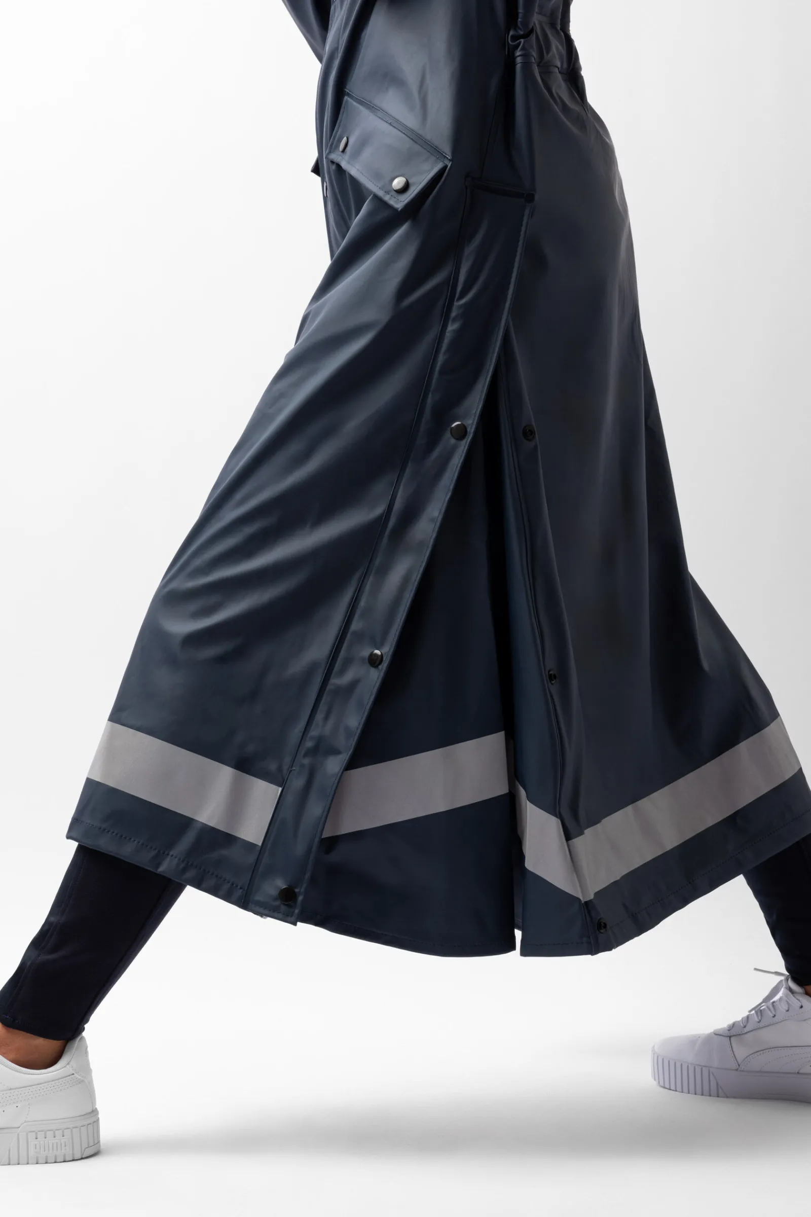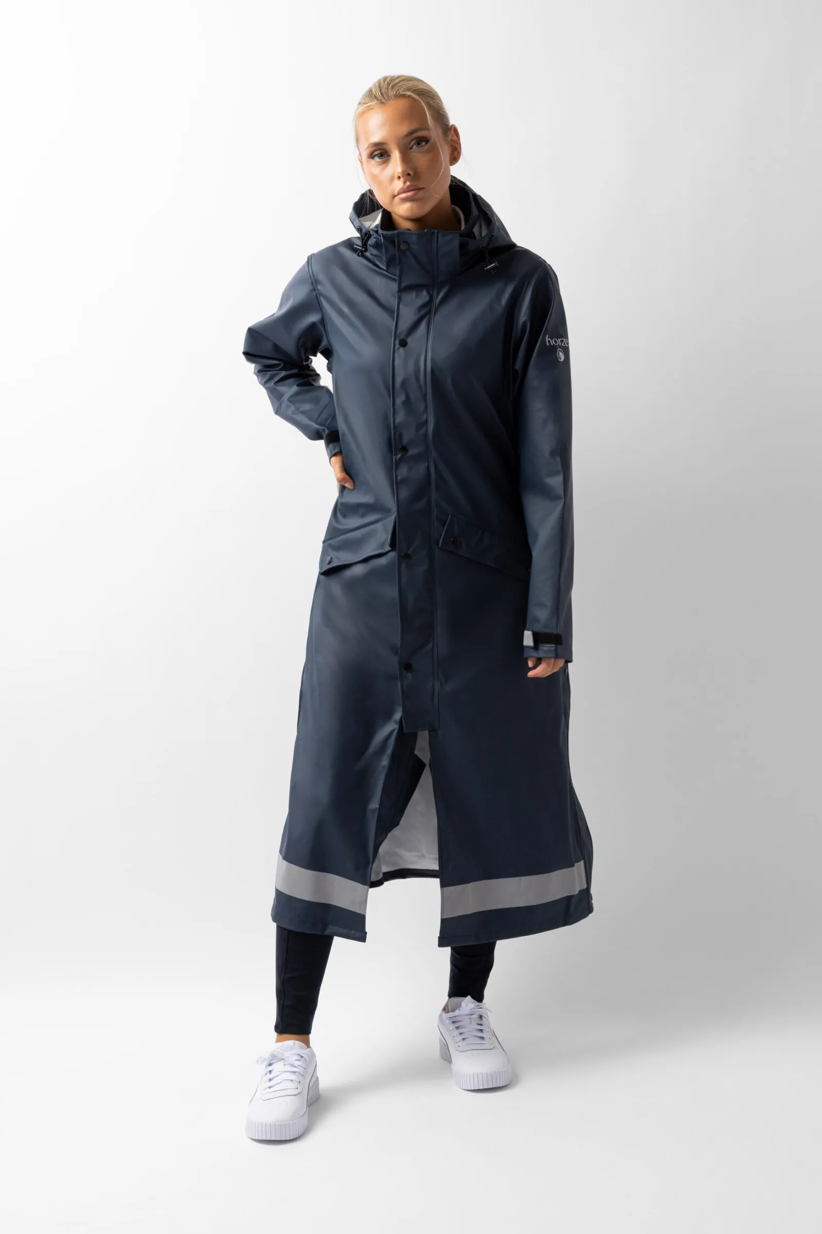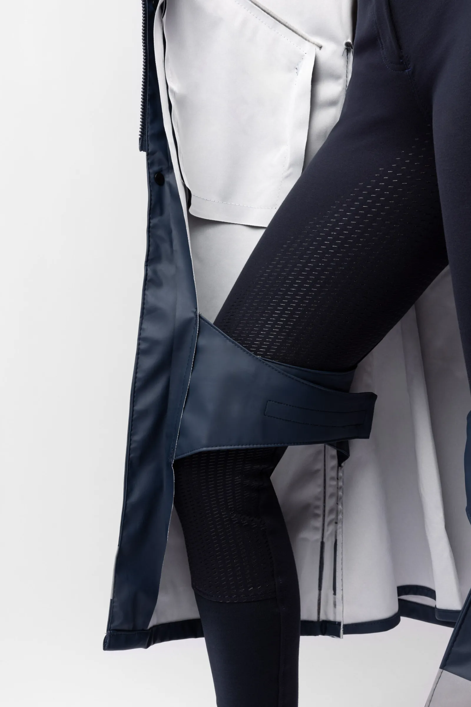 Denne lange regnjakken gjør det morsomt å ri i regnet.Den har splitt på sidene som lukkes med trykknapper.Dette gjør det lett å enkelt åpne jakken over lårene og salen slik at du holder de tørre i regnet.Beinsnorer på innsiden holder den vanntette kanten på plass når du rir.Hetten beskytter hodet og kan fjernes når regnet stopper.De justerbare ermene og elastikken bak sikrer at denne regnjakken har en perfekt passform og fleksibilitet.Reflekterende striper på hetten og nederste kant gjør at du er synlig i mørkt og grått vær.Store lommer holder eiendelene dine trygge og tørre.