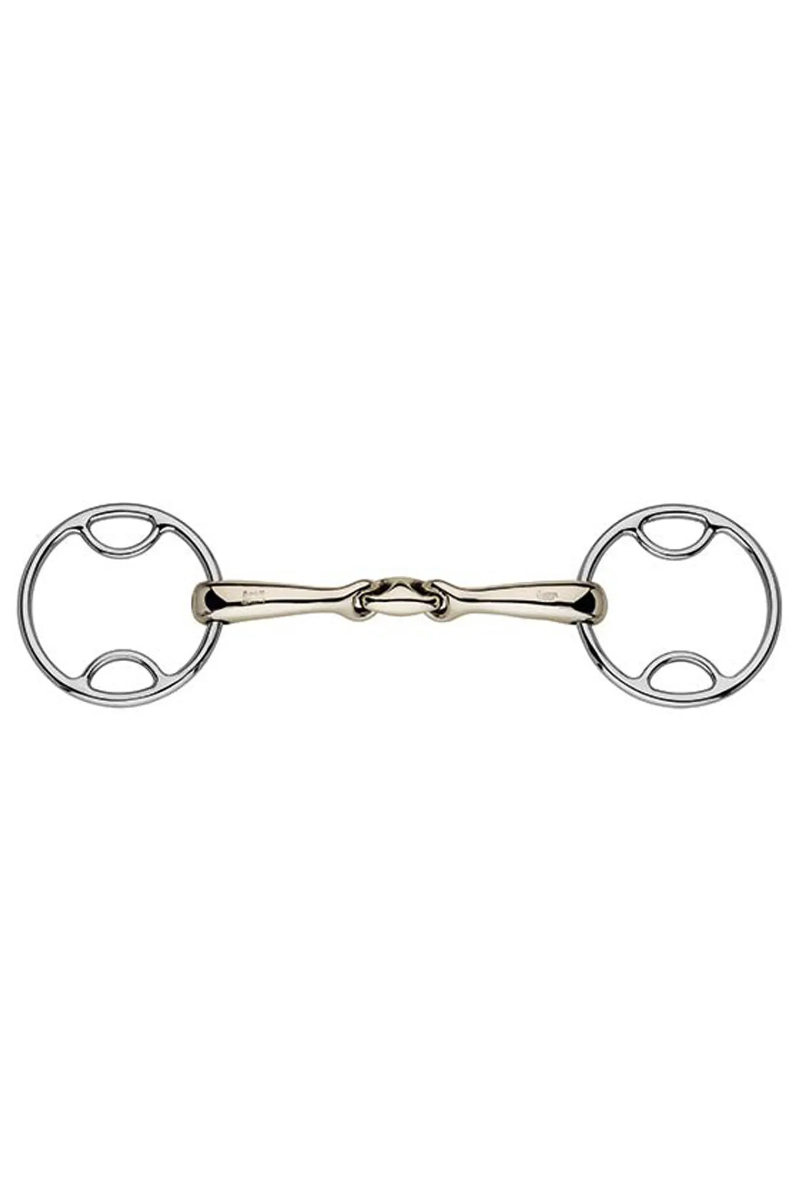 Munndel: Tredelt.Materialer: Sensogan med rustfritt stål på sidene.Tykkelse på bittet: 16 mm.Diameter på ringene: 70 mm.Type ringer: Universal.
