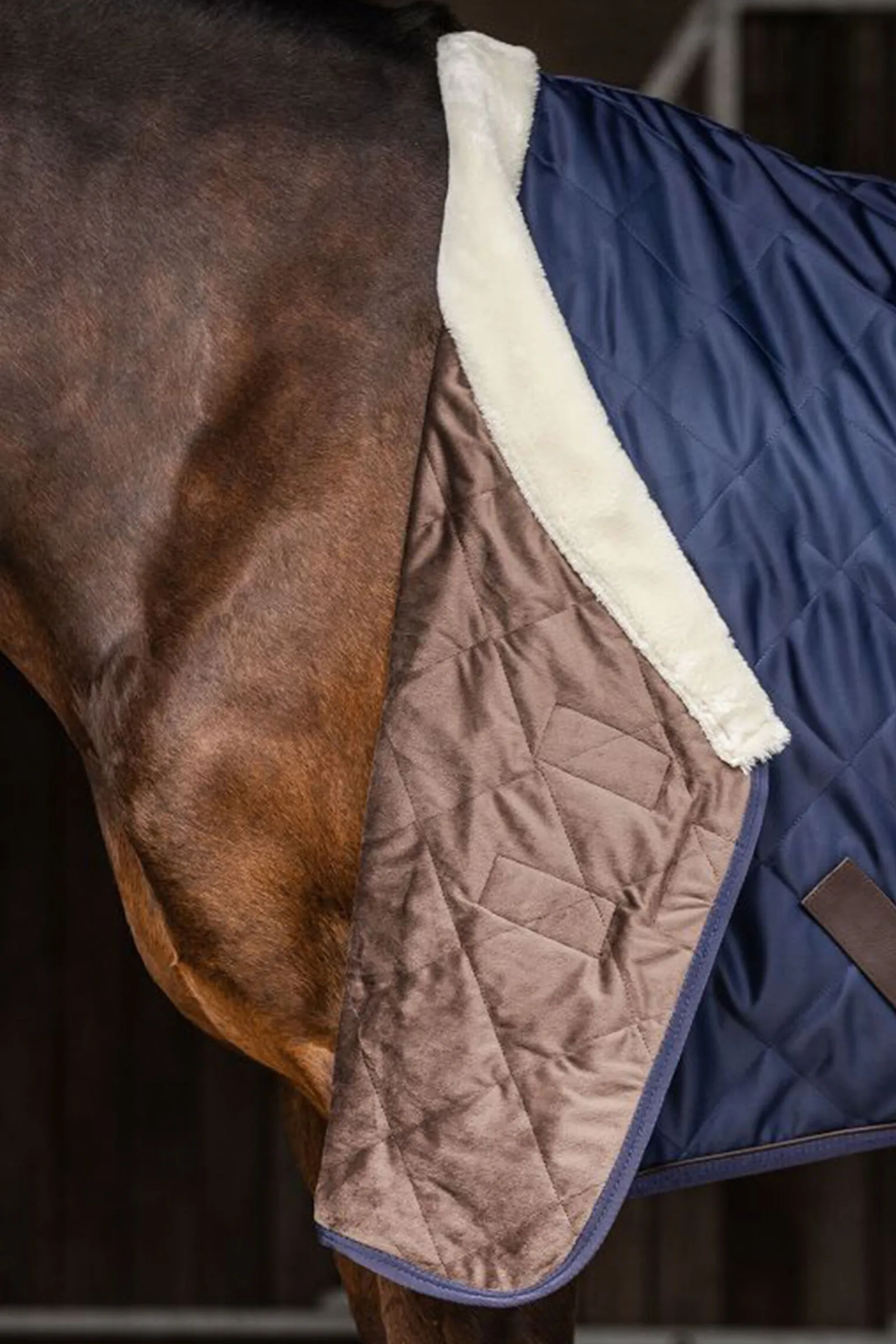 Høykvalitets transportdekken foret med kunstig kaninpels for kalde dager. Kunstig kaninpels holder hestens kroppsvarme optimalt, er spesielt myk og forhindrer gnagsår. Dekkenet er komplett med justerbare og avtakbare kryssgjorder, dobbel T-frontlukking og metallringer for festing av halestropp.