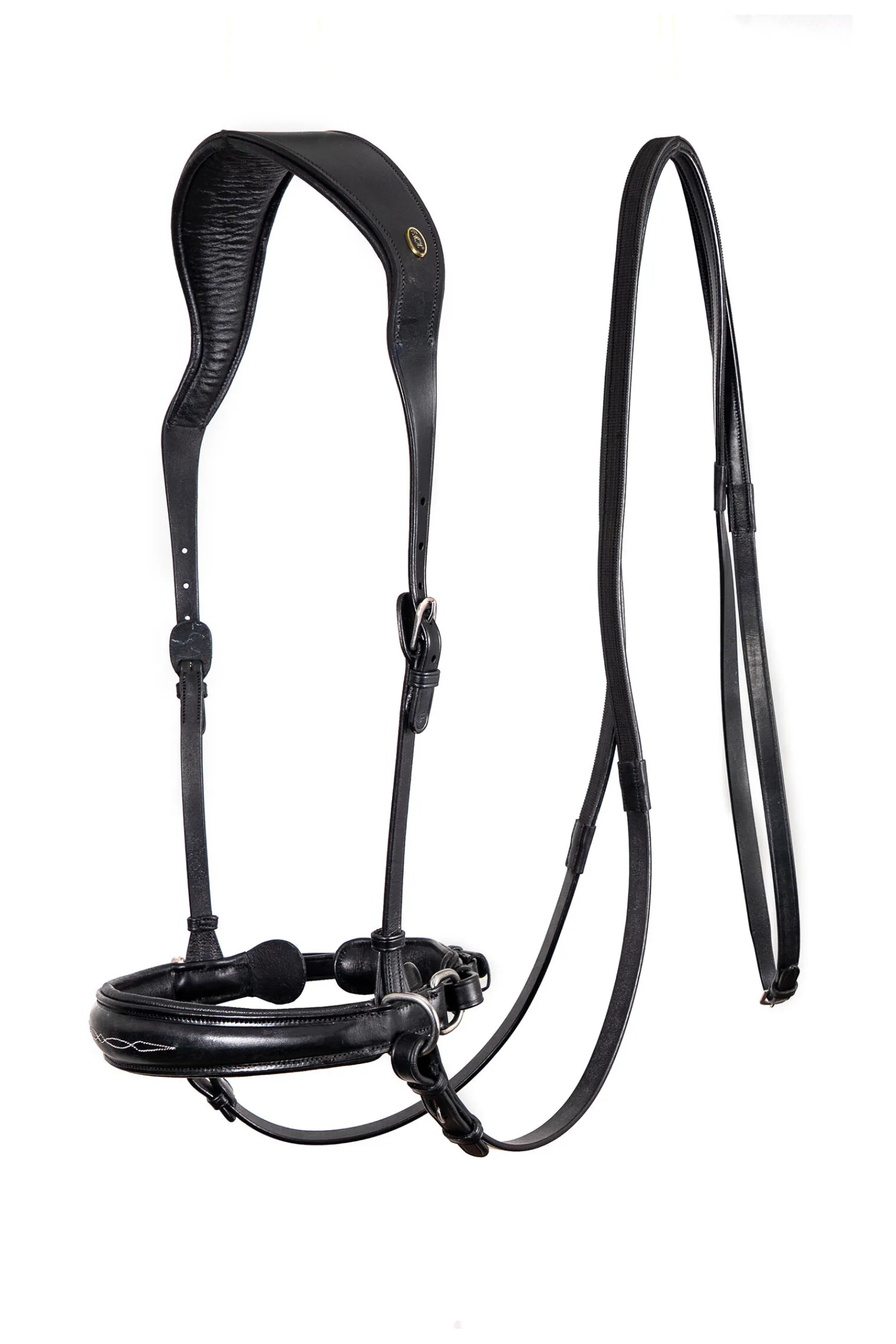 - Tøyler i engelsk lær med kroker og gummigrep på baksiden