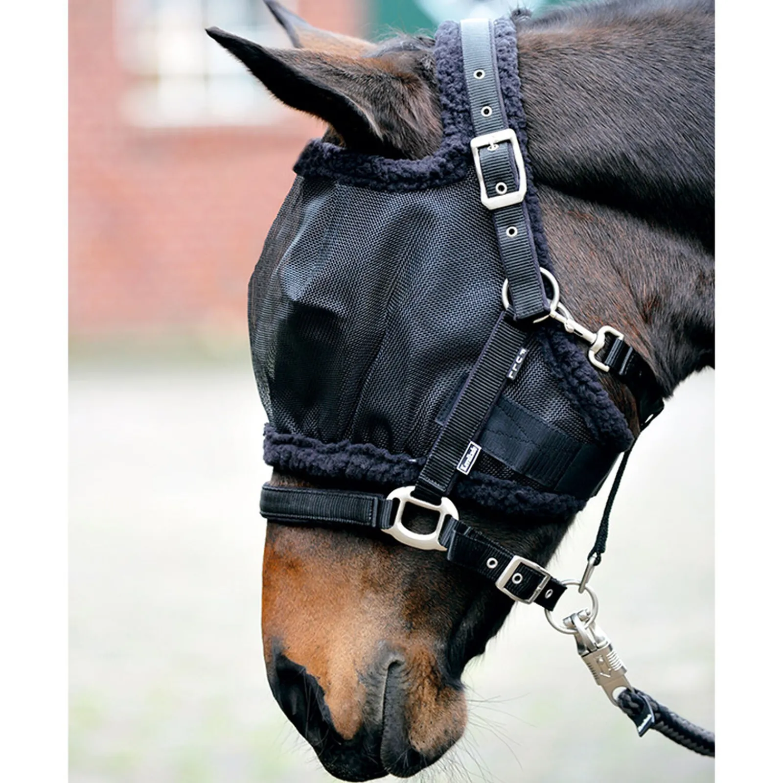 Fluemaske uten ører laget av finmasket, solid stoff. Med borrelås, justerbar. Elastisk feste med lukking laget av kunstig ull, sitter derfor stramt på hodet.