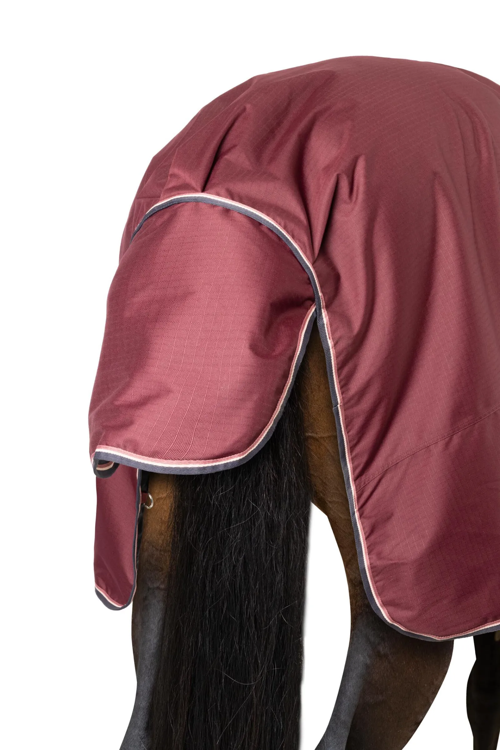 Dette vanntette regndekkenet er laget av et pustende stoff som holder hesten din tørr og komfortabel. Den gode passformen ved skuldre og nakke forhindrer at dekkenet sklir, og høye bogsplitter gir bevegelsesfrihet. De to spennene foran, kryssgjordene, beinsnorene med klips og haleflappen gir den perfekte beskyttelsen hesten din trenger.
