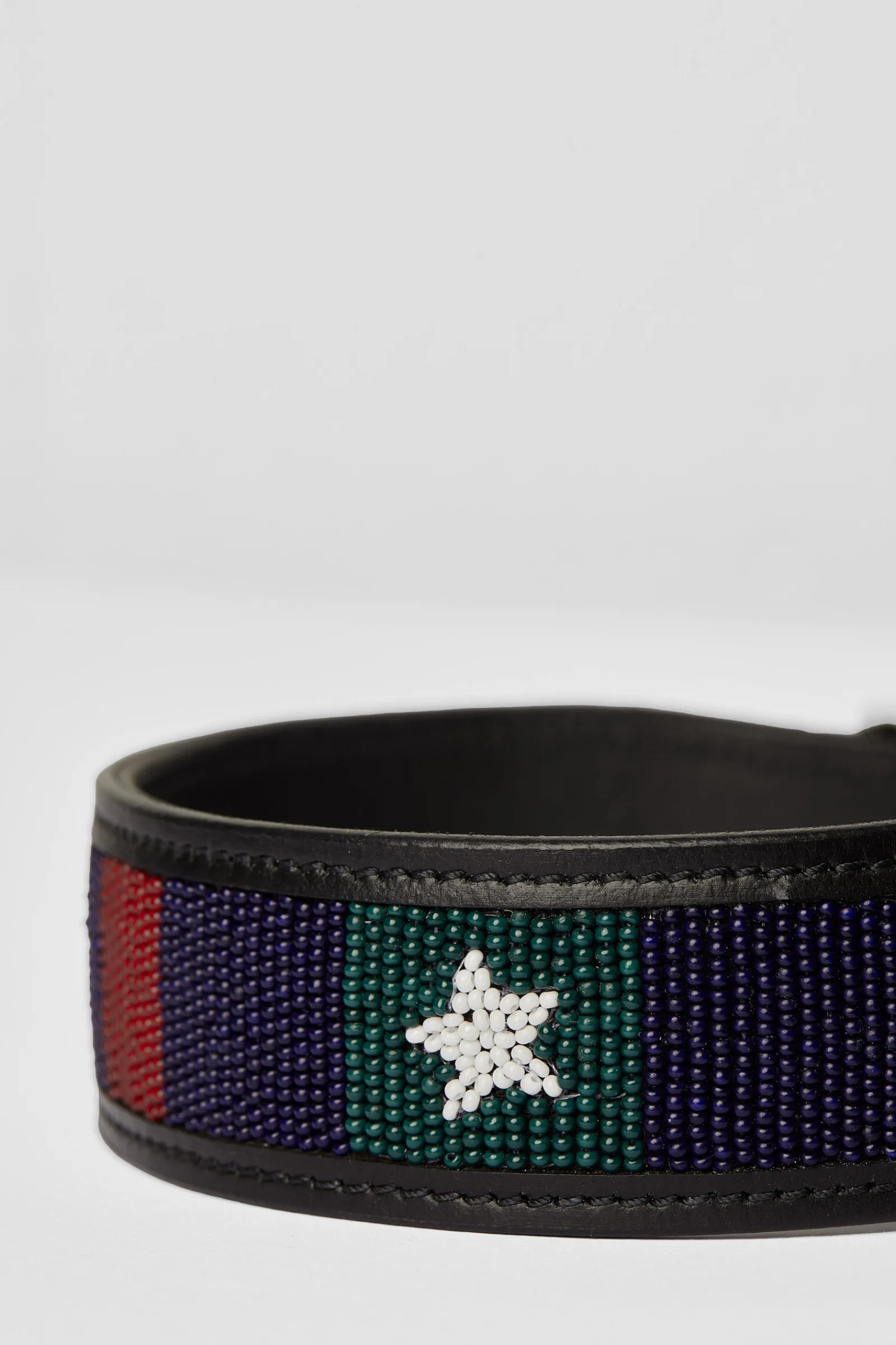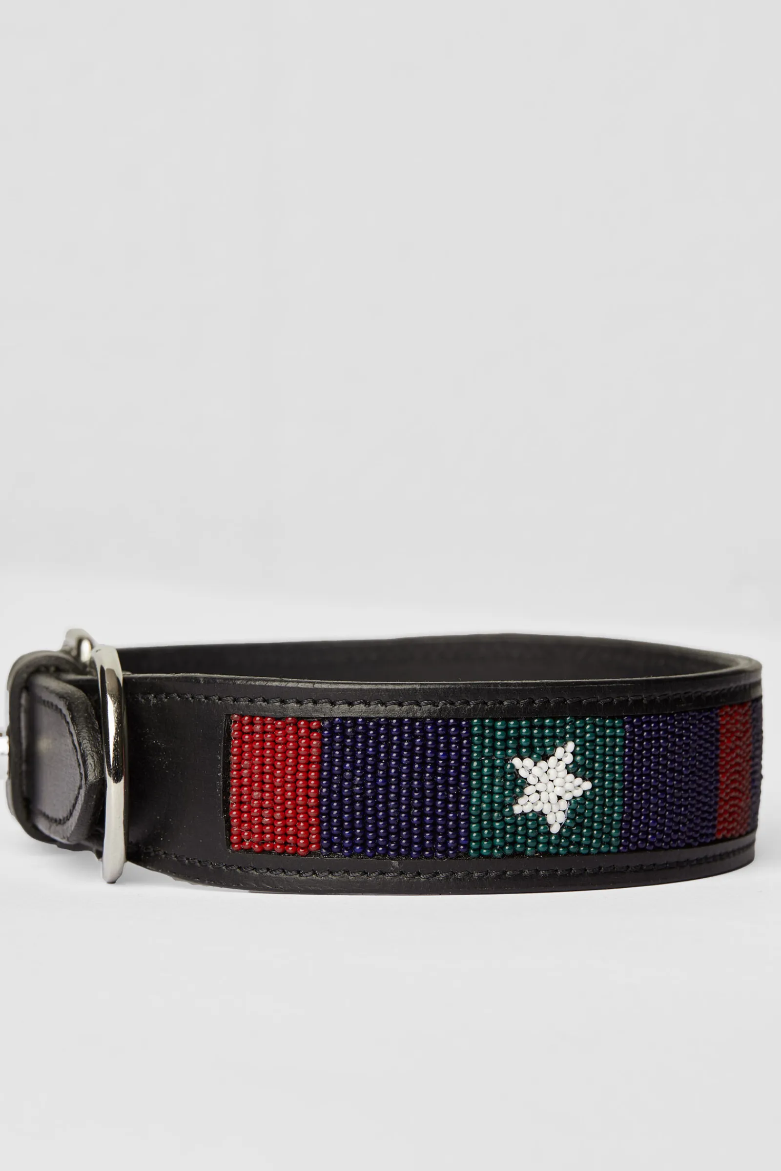 Horze Noir halsbånd til hund er dekorert med stjerner og striper, noe som gir et fargerikt preg på hundens utstyr.Det robuste materialet på innsiden er lett å rengjøre.En justerbar spenne gir perfekt passform, og metallring for feste til båndet.