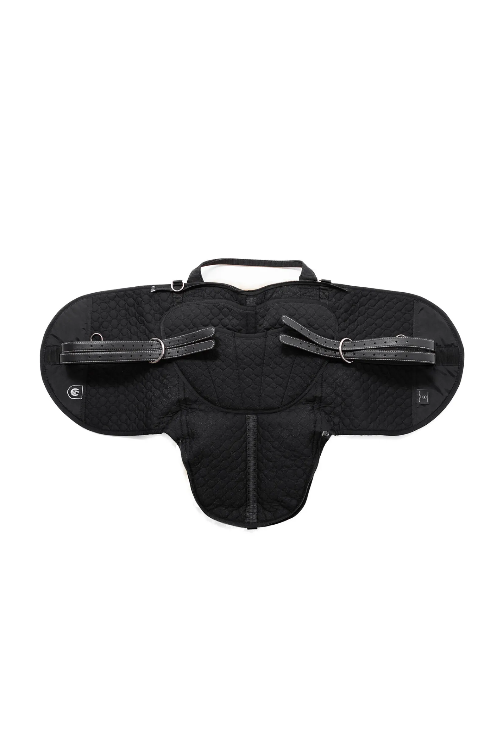 Setet er laget av lammeskinn, med en ullengde på ca. 30mm på undersiden bak. Fleeceruller på sidene gir ekstra stabilitet, og øker følelse av å sitte trygt. Saueskinnet i setet kan tas av med glidelås, og en spesiell bomplate kan settes inn i lommen som følger med. Bommen har stigbøylefester, slik at du kan sette deg opp på hesten ved hjelp av stigbøylene. Avtagbart fôr på venstre og høyre side av ryggraden gir bedre komfort i setet, og beskytter hestens rygg. Utformet spesielt til hester.Full og ponnistørrelser selges under produktnummer: 14483.