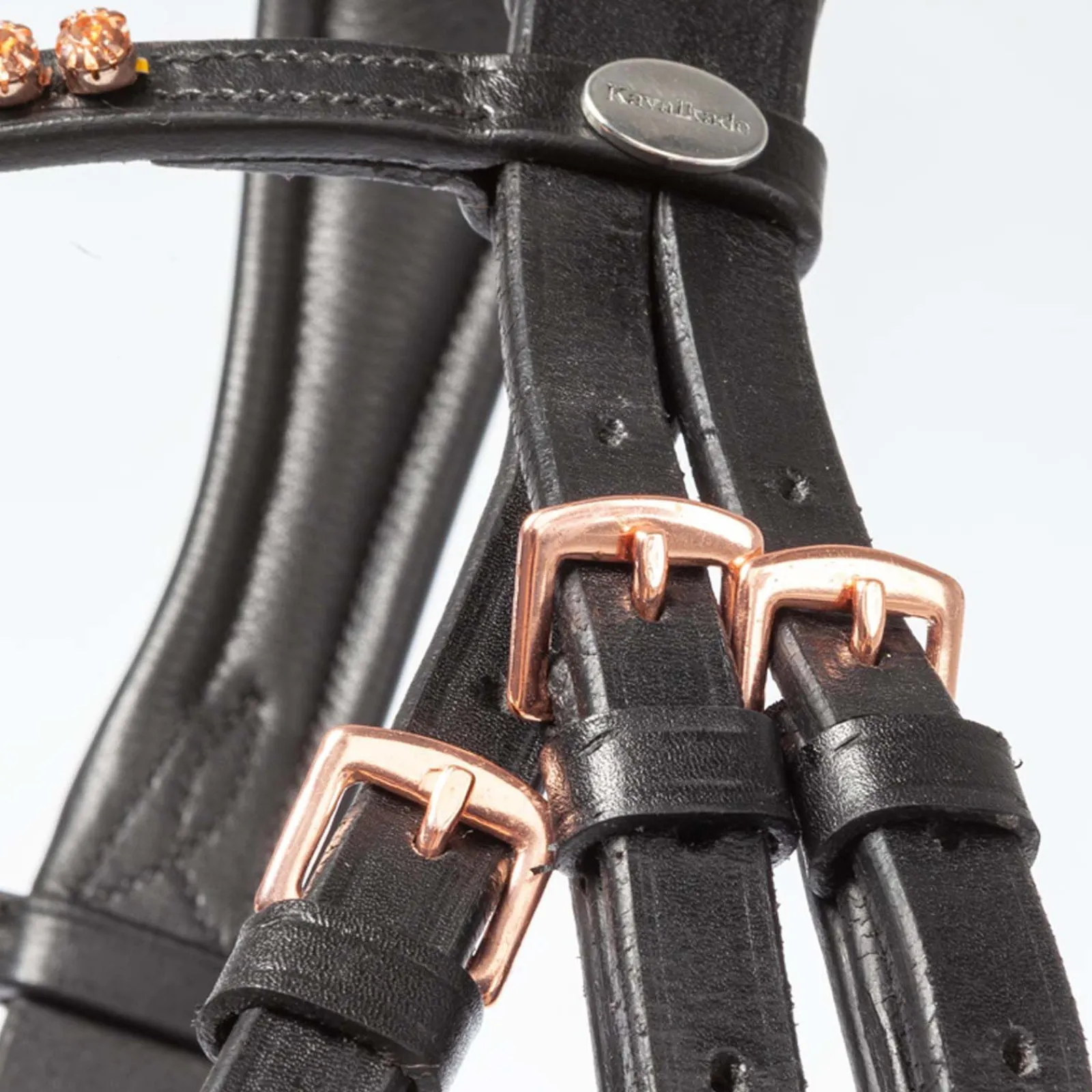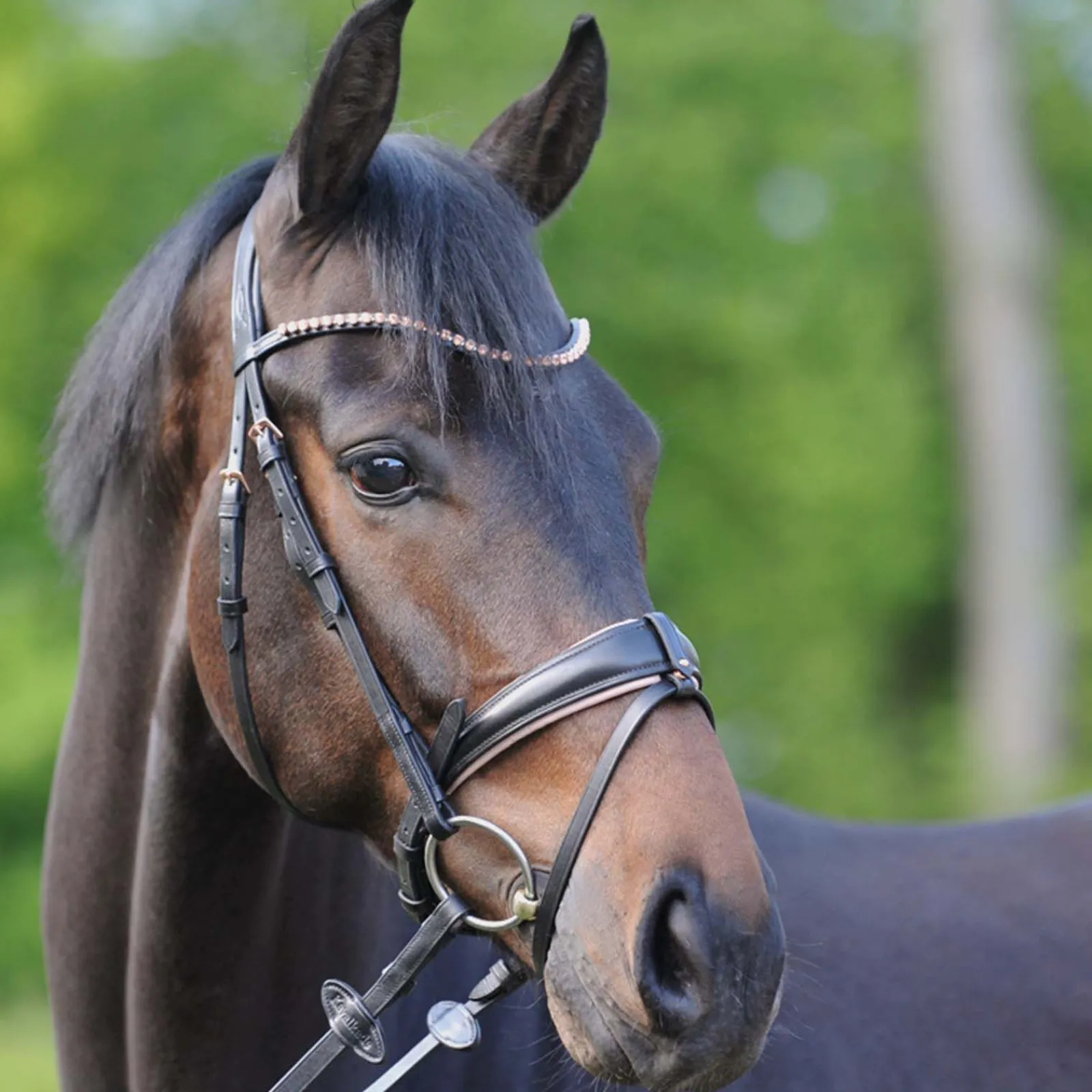 - Svensk kombinasjonsnesereim, justerbar på begge sider. Normalt buet pannebånd med rosa pyntesteiner. Anatomisk, ekstra bred nesereim. Nesereimen er mykt fôret, konisk og i rosé. Avtakbar flash-nesereim. Gummidekte tøyler med stoppere (16mm).