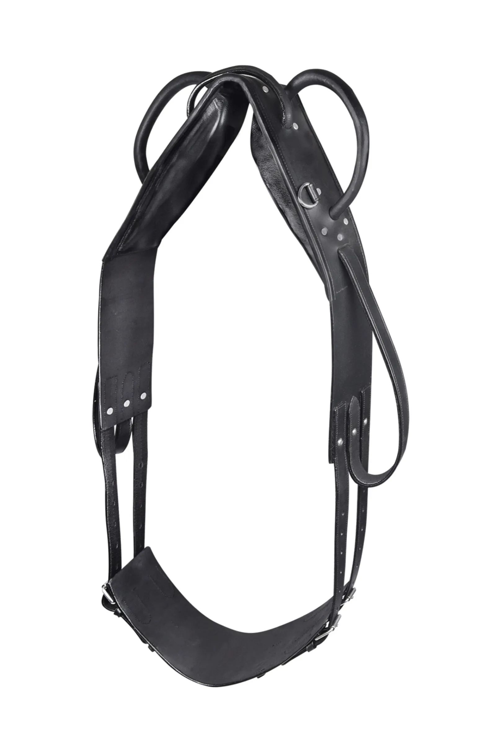 Voltige- og lonsjeringsgjord i kraftig lær; 3 ringer; fotbøyler på begge sider, kraftig håndtak, regulering på begge sider.