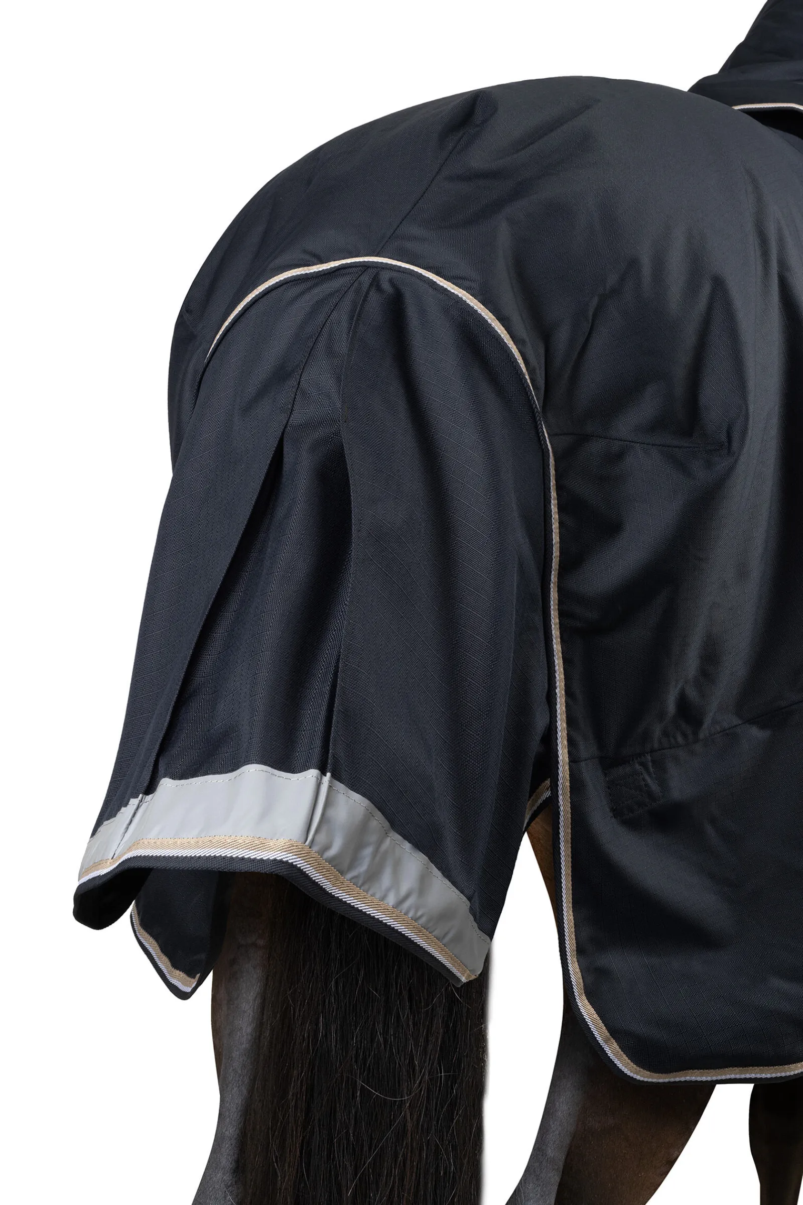 Elegant B Vertigo i dyp blåfarge og i klassisk stil. Dette medium tykke dekkenet har en nydelig framtoning, samtidig som det har alle detaljer og kvaliteter du forventer fra denne toppmodellen. Den avtakbare halsen gir en ekstra fordel på dette beskyttende dekkenet, og den kan festes på for ekstra varme når været forandrer seg. Se for deg at hesten din er ute og hygger seg mens uvær bygger seg opp i bakgrunnen. Ta på halsen og hesten kan fortsette å være komfortabel ute mens vær og vind herjer.