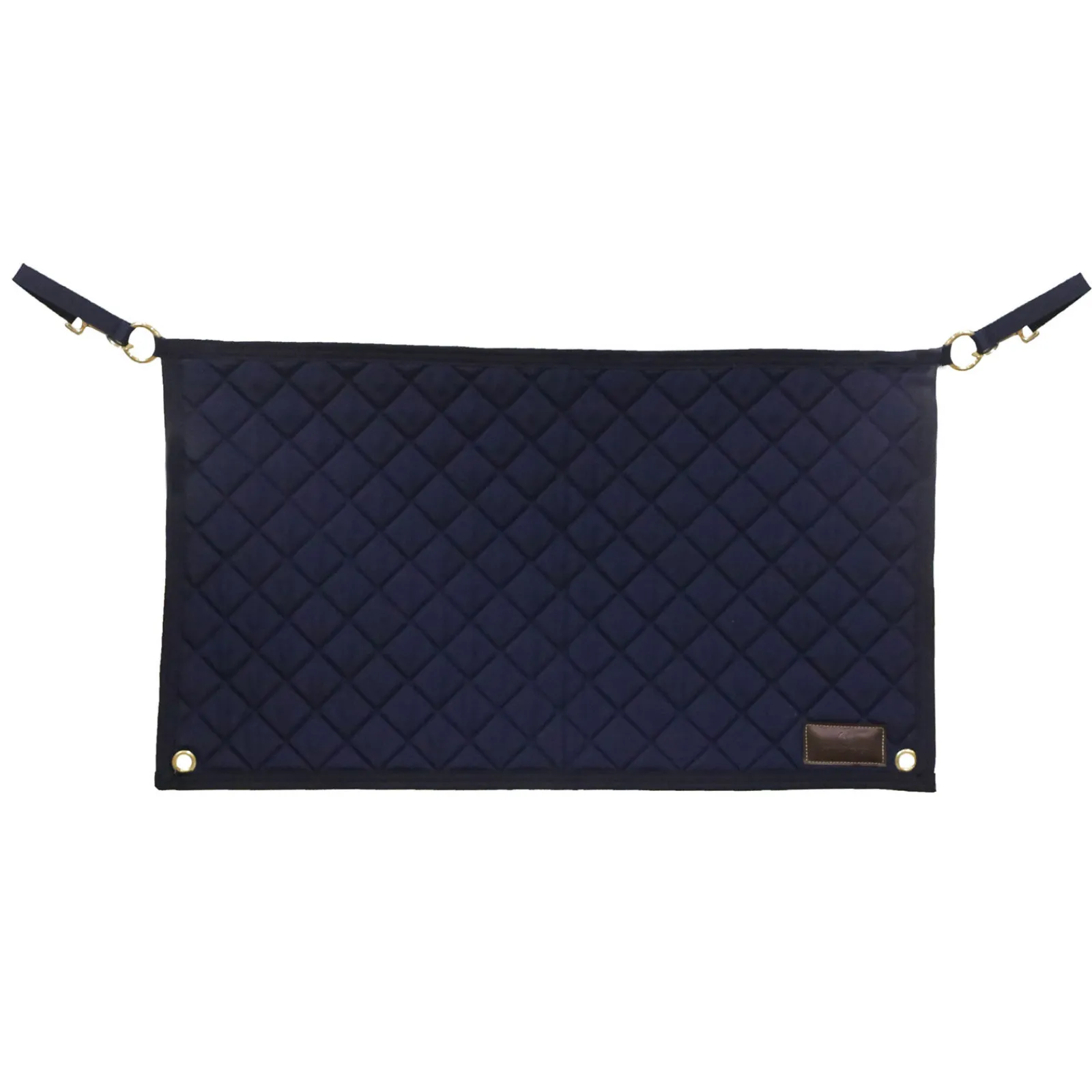 The Kentucky Stable Guard enables your horse to put his head outside of the stall to relax. This Stable Guard has two reinforced, gold coloured rings in the upper corners with a nylon strap with snap hook to attach to the stable. There are two more reinforced rings in the bottom corners to attach the Stable Guard. The Diamond Quilting pattern and the artificial leather Kentucky logo create a fancy look. This Stable Guard is a perfect match to our Head Protector and Stable Curtain The Stable Guard is made out of 600D High Tenacity Polyester and is machine washable at 30°, no dryer.