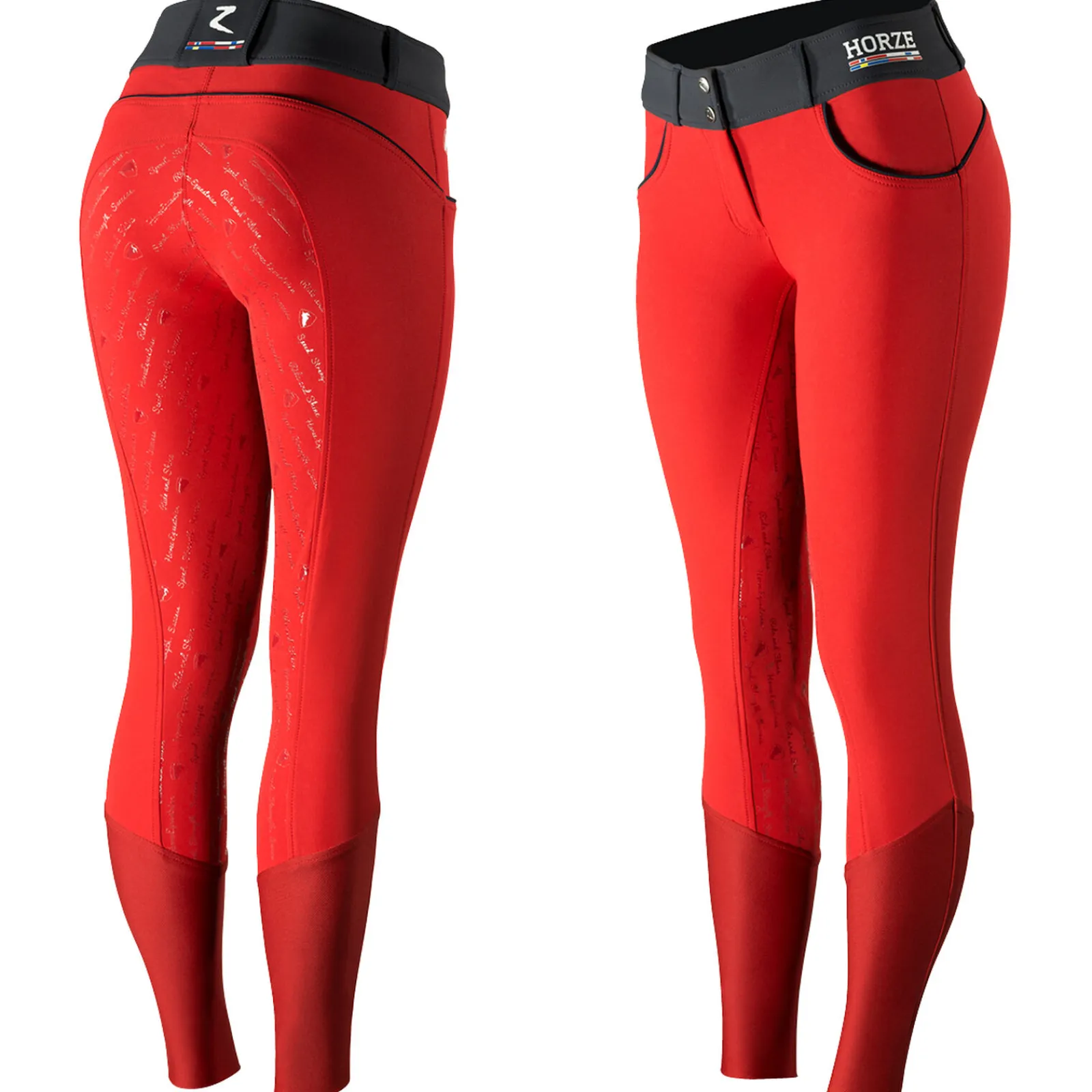 Helforsterkede ridebukser med motiverende ord på silikontrykket er et perfekt valg for et ettermiddagsritt. Med ord som «Speed, strength, success» og «Ride and Shine» ispedd Horze jumper-logoen og «Horze Equestrian»-merket gjør disse ridebuksene til mer enn et par ridebukser. De vil løfte motivasjonen når du klatrer opp i salen. Disse lette, men samtidig holdbare ridebuksene blir bare mer og mer komfortable etter hver vask, og etterhvert som de formes etter kroppen din. Det helforsterkede setet med silikon gjør at du ikke blir for varm, og det er komfortabelt både mens du er i salen og på bakken. Med akkurat nok klister-grep er disse ridebuksene perfekte for trening. Ta med deg et par av disse sporty ridebuksene i hver farge for å gjøre treningsdagene morsomme og moteriktige.