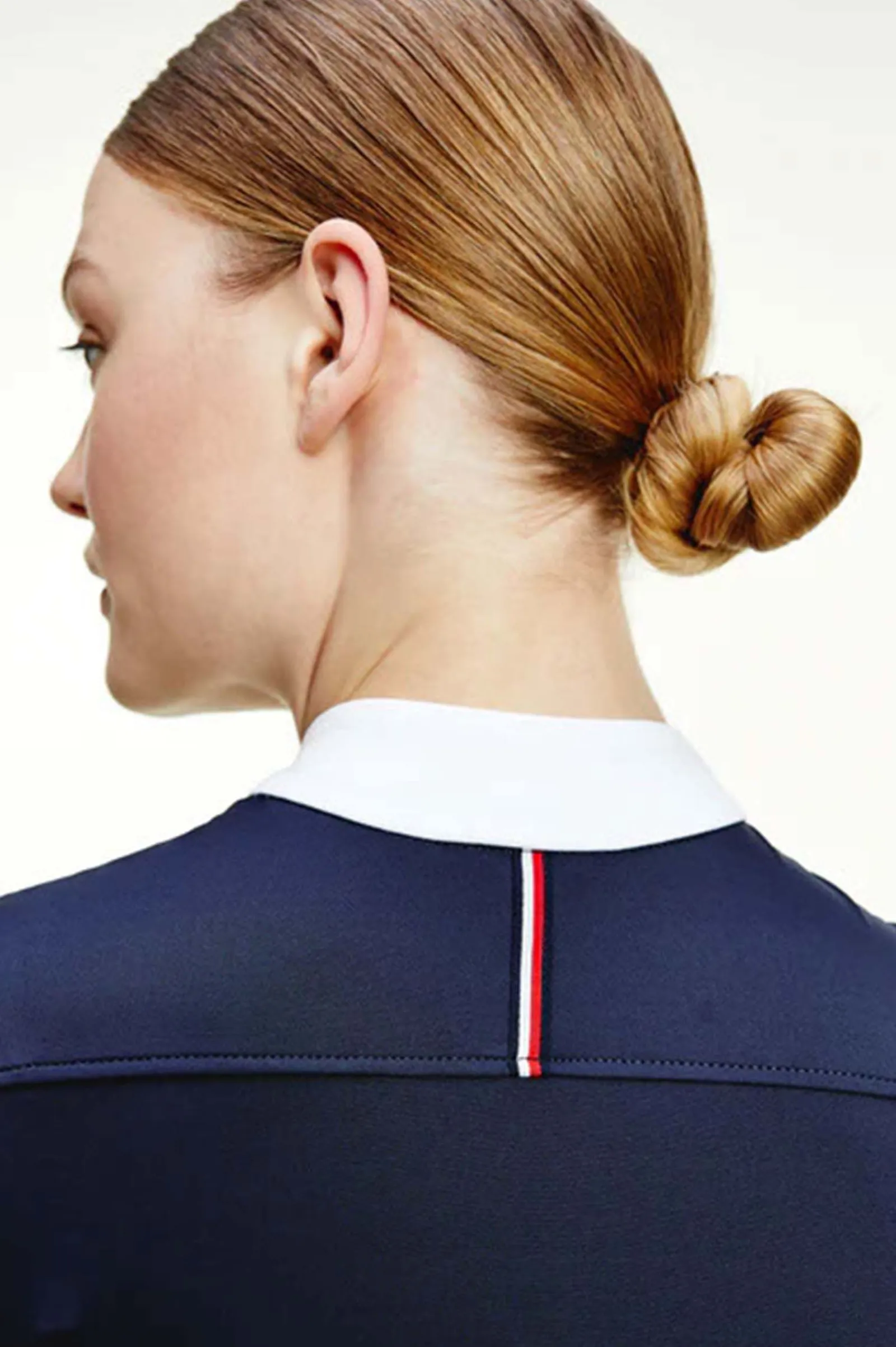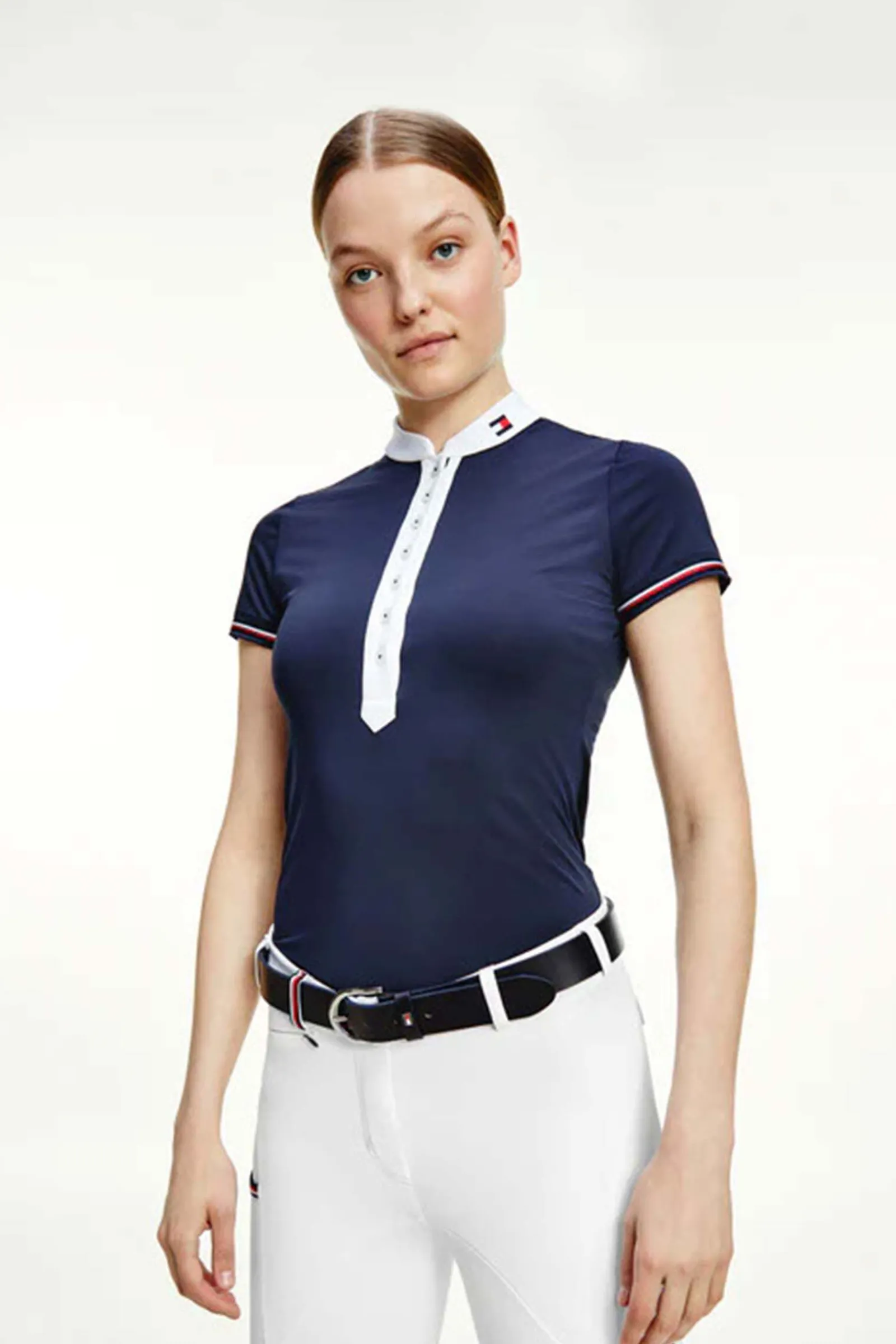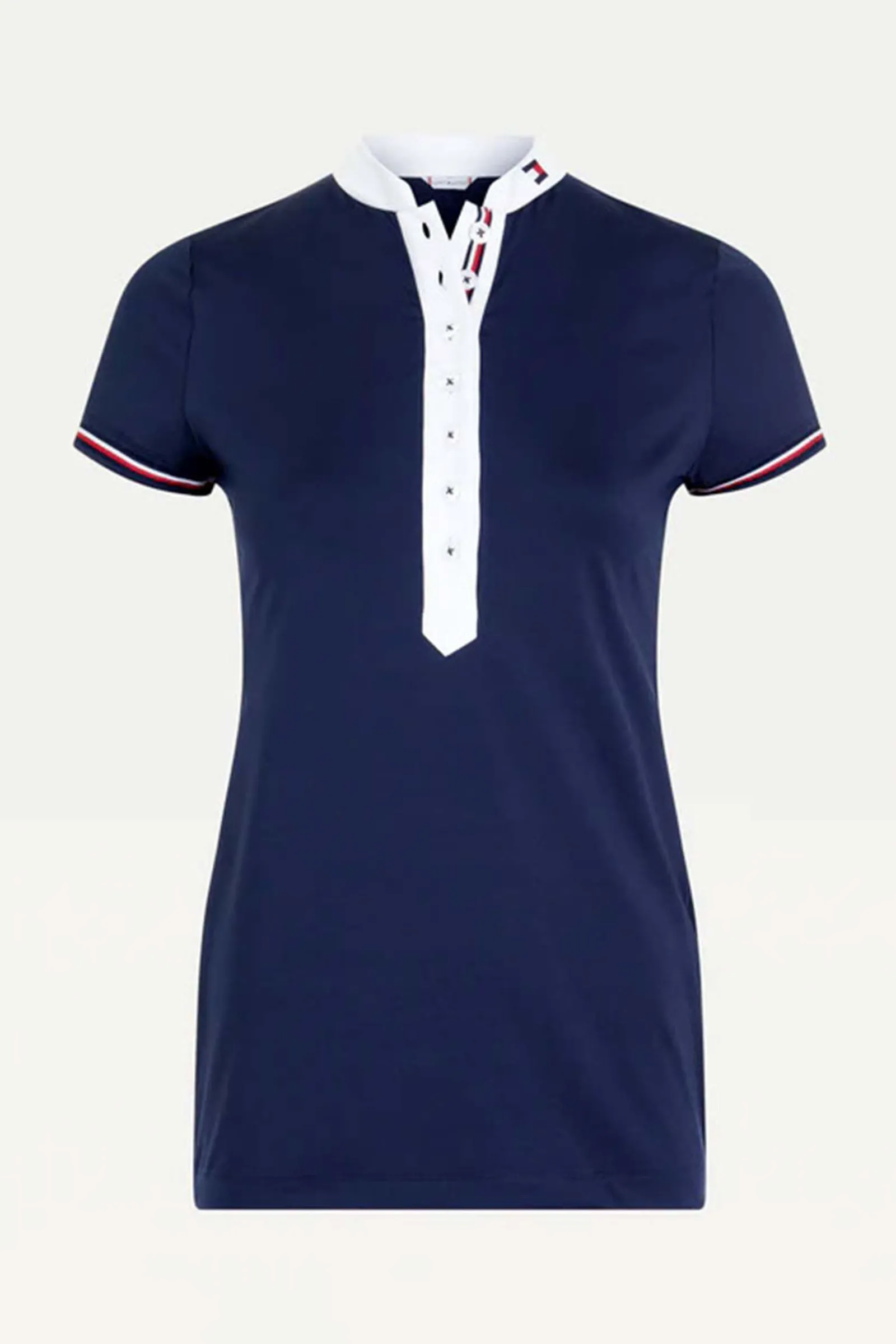En tidløs, tettsittende, kortermet stevneskjorte med lang knappestolpe og skinnende hvit Mao-krage.Lite logobroderi på kragen, TH Global stripe-bånd midt på bak, og under knappestolpen.