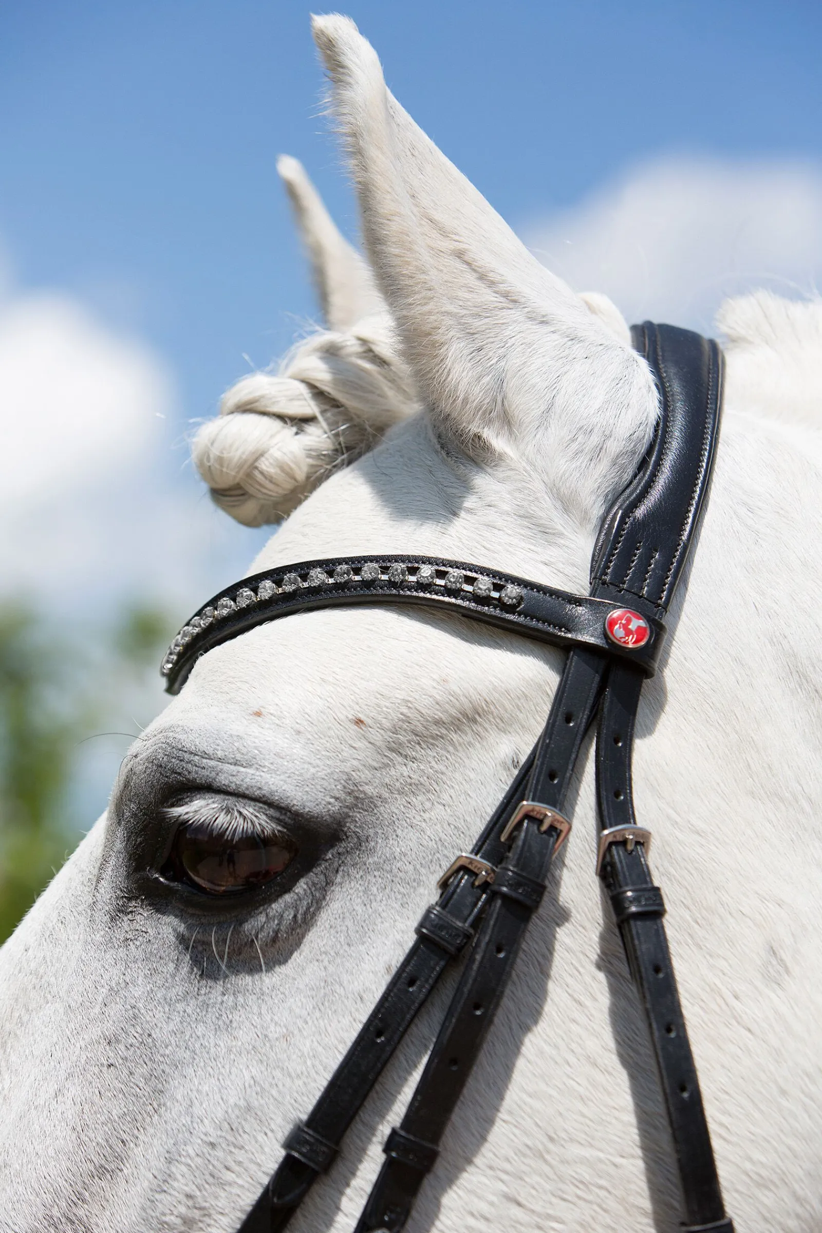 Hodelag i ekstremt mykt lær, med buet pannebånd med krystaller.