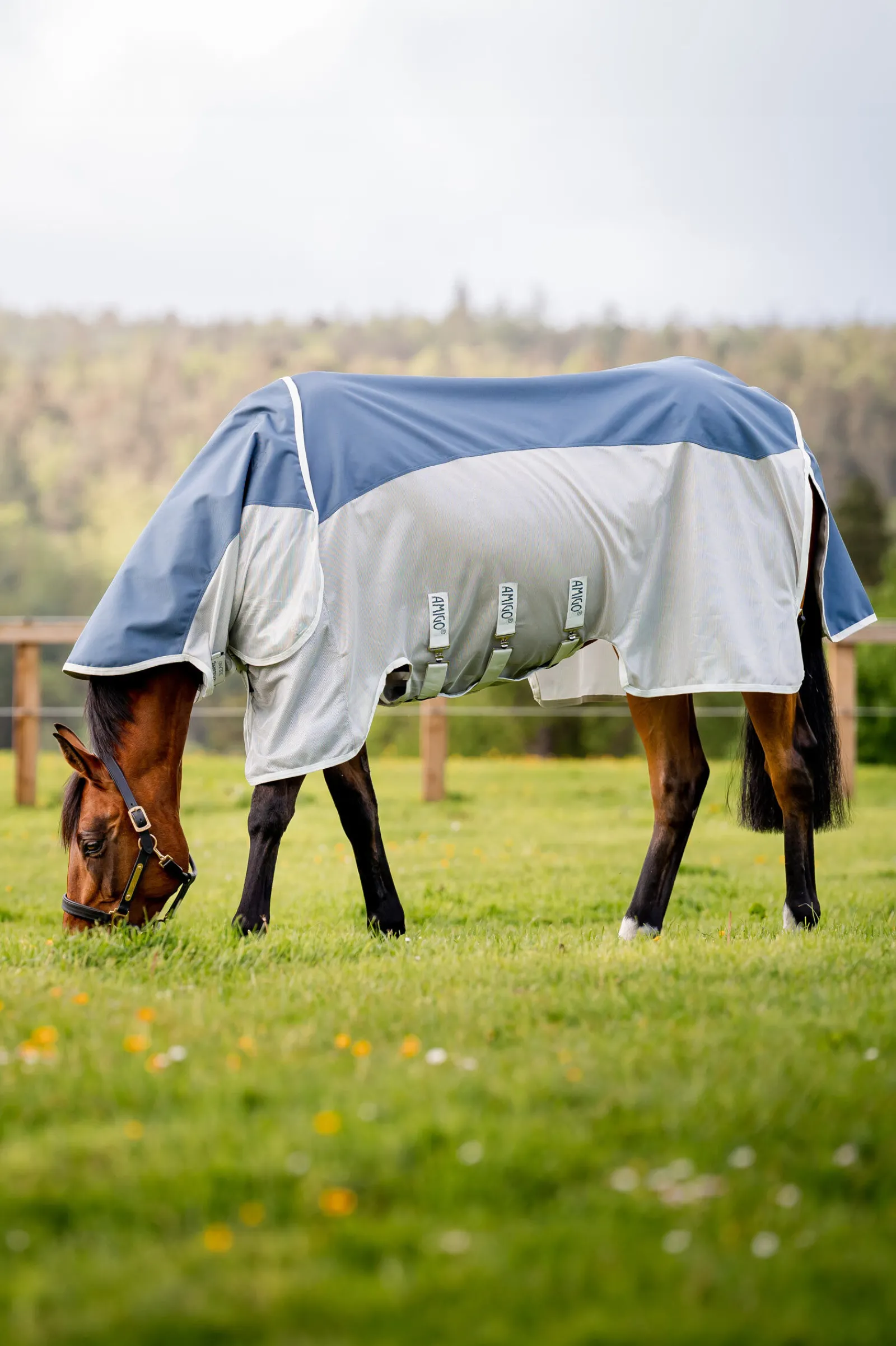 Dekkenet med ryggpanel i 1200D polyester, sider i mesh og innside er alt laget av 100% rPET, et positivt bidrag til miljøet.Den lette, patenterte disc-lukkingen reduserer trykk og forhindrer gnag på skuldrene.Den medfølgende halsen kan festes til dekkenet avhengig av hestens behov og været.Tre rette gjorder sikrer optimal dekking, noe også den ekstra lange, vanntette haleflappen gjør.Buene ved beina gir mer bevegelsesfrihet når hesten gresser.