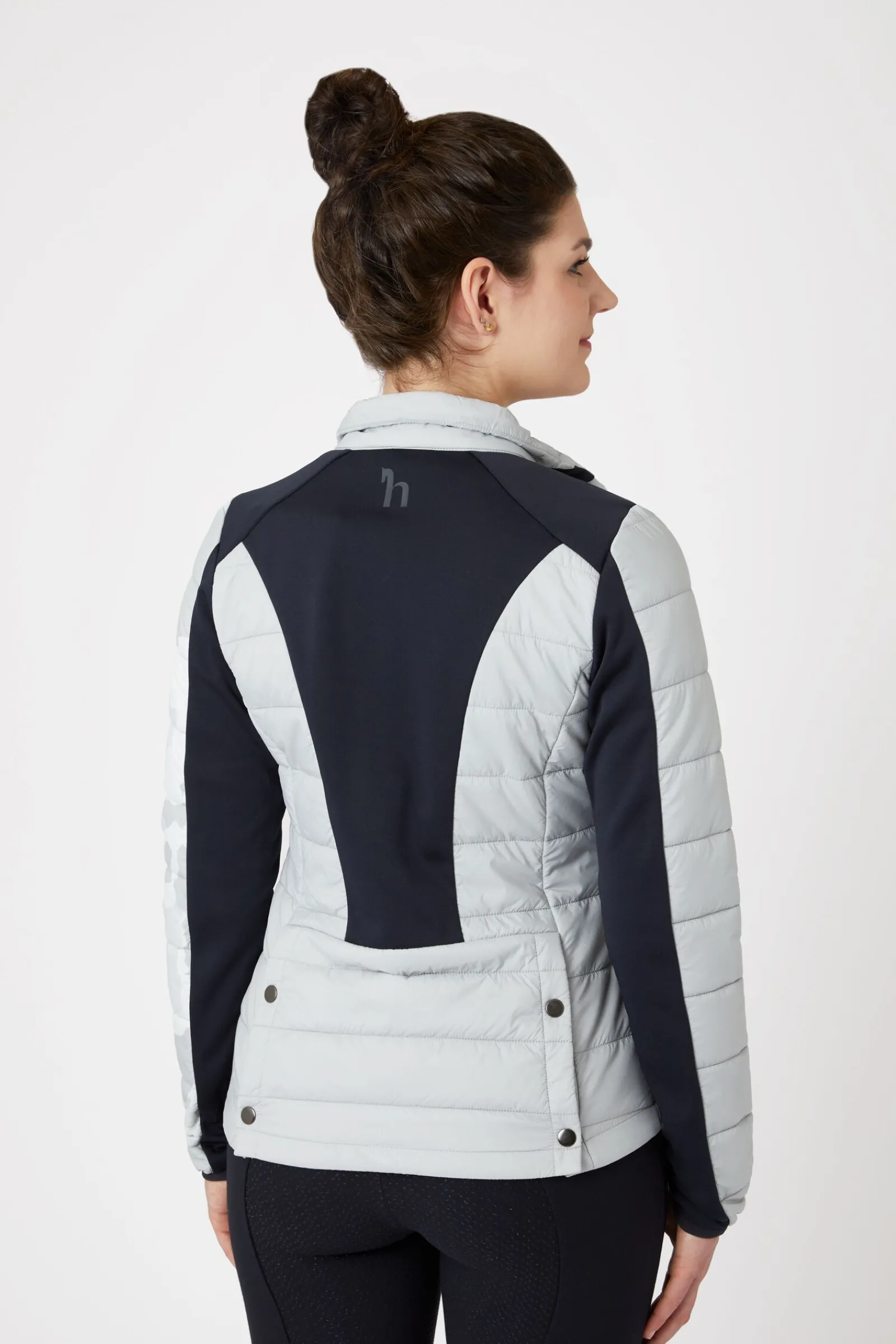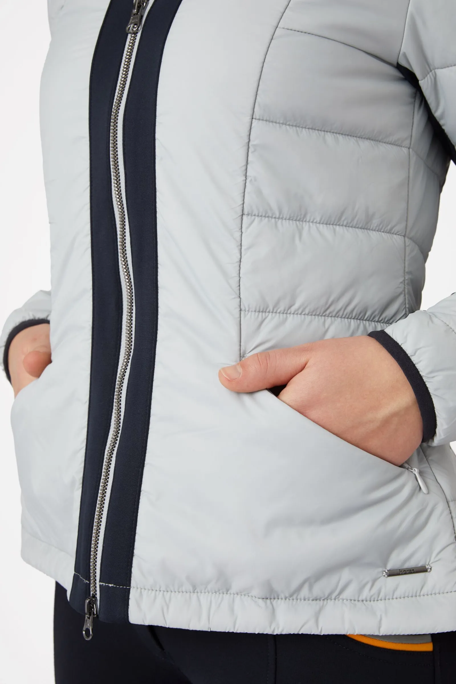 Denne funksjonelle hybridjakken til dame har et lett fôr, er vattert på sidene og har et ensidig, elastisk fleecepanel bak, samt på ermene.Kontrastbånd på armene og glidelåsen.Vannavvisende og vindavvisene gjør dette til et perfekt plagg å bruke dersom du ønsker flere lag.3D logotrykk bak ved nakken og en liten logoplate i metall på kanten foran.To skjulte glidelåslommer holder eiendelene dine trygge under rideøktene.Knappene bak åpner en ridesplitt for økt bevegelsesfrihet i salen.