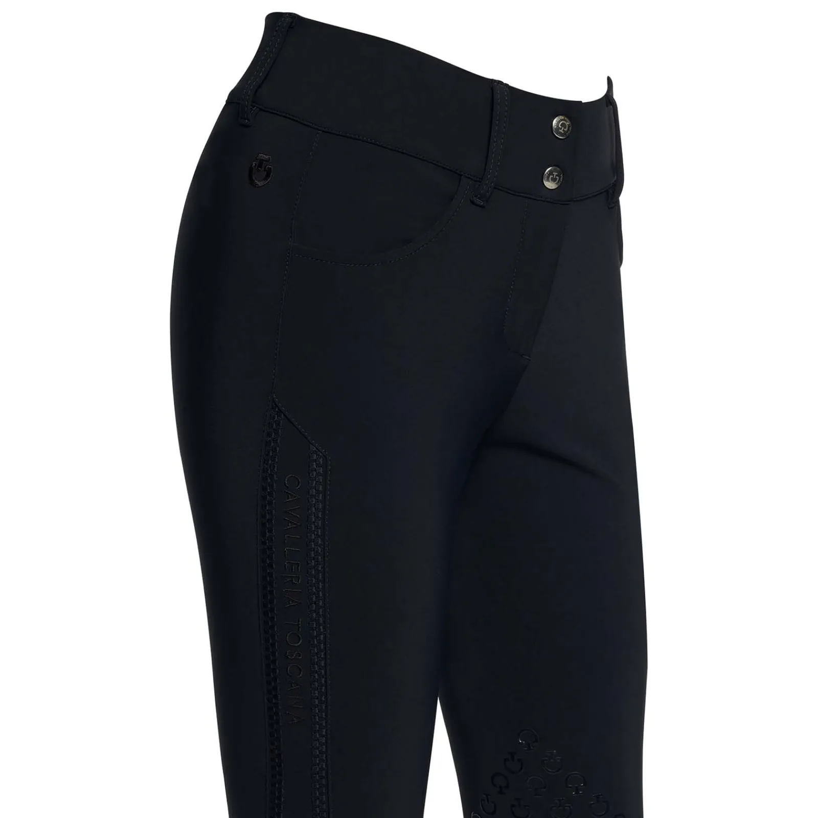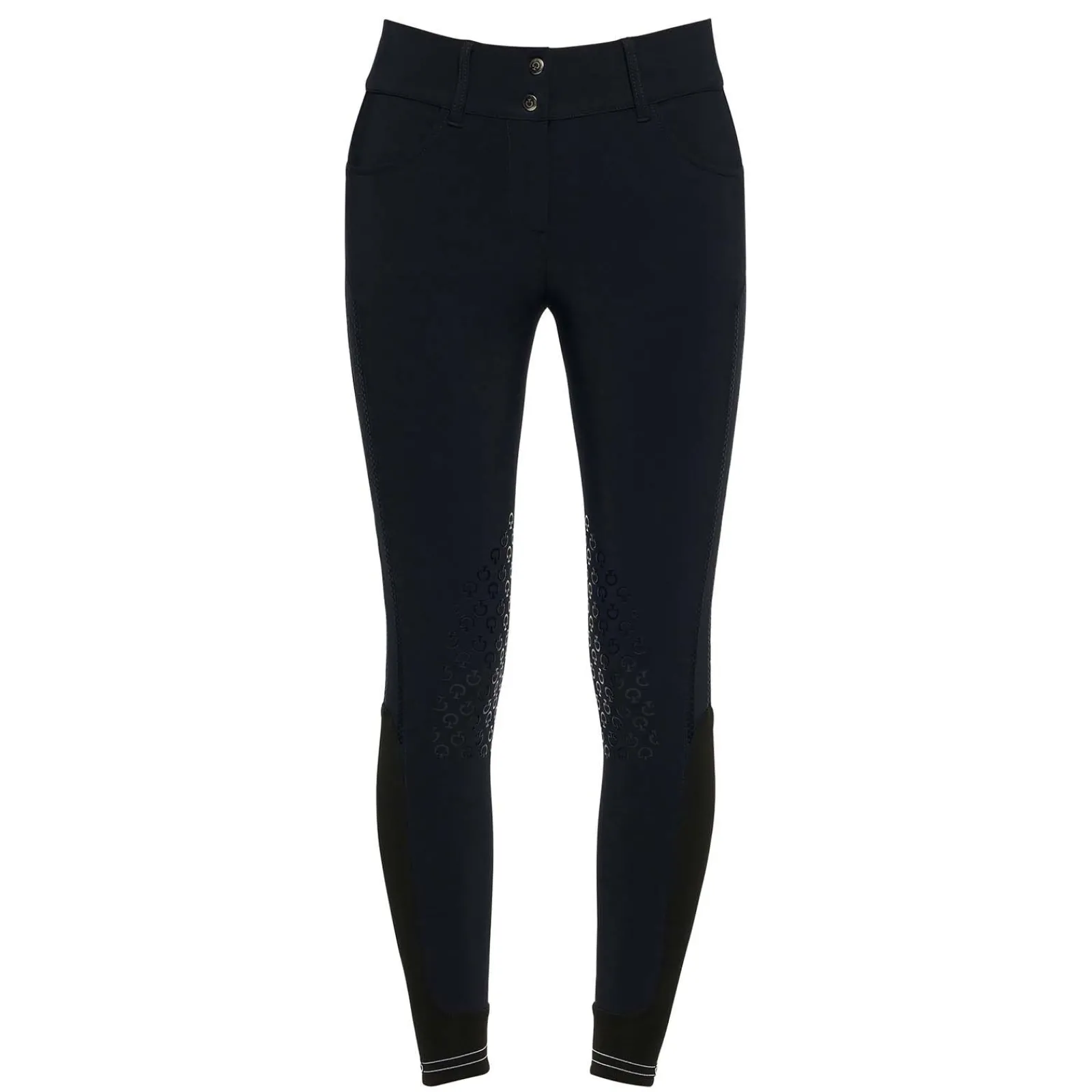 The women’s riding breeches are made from 4-way stretch jersey. The technical material provides high breathability and freedom of movement: this fabric adheres perfectly to your body, without constriction. The transparent knee grip allows the right stability on the horse, while the stretch-knit socks improve the fit beneath your boots. It features two front pockets and a zip up front with button and an embrodery write on the leg.