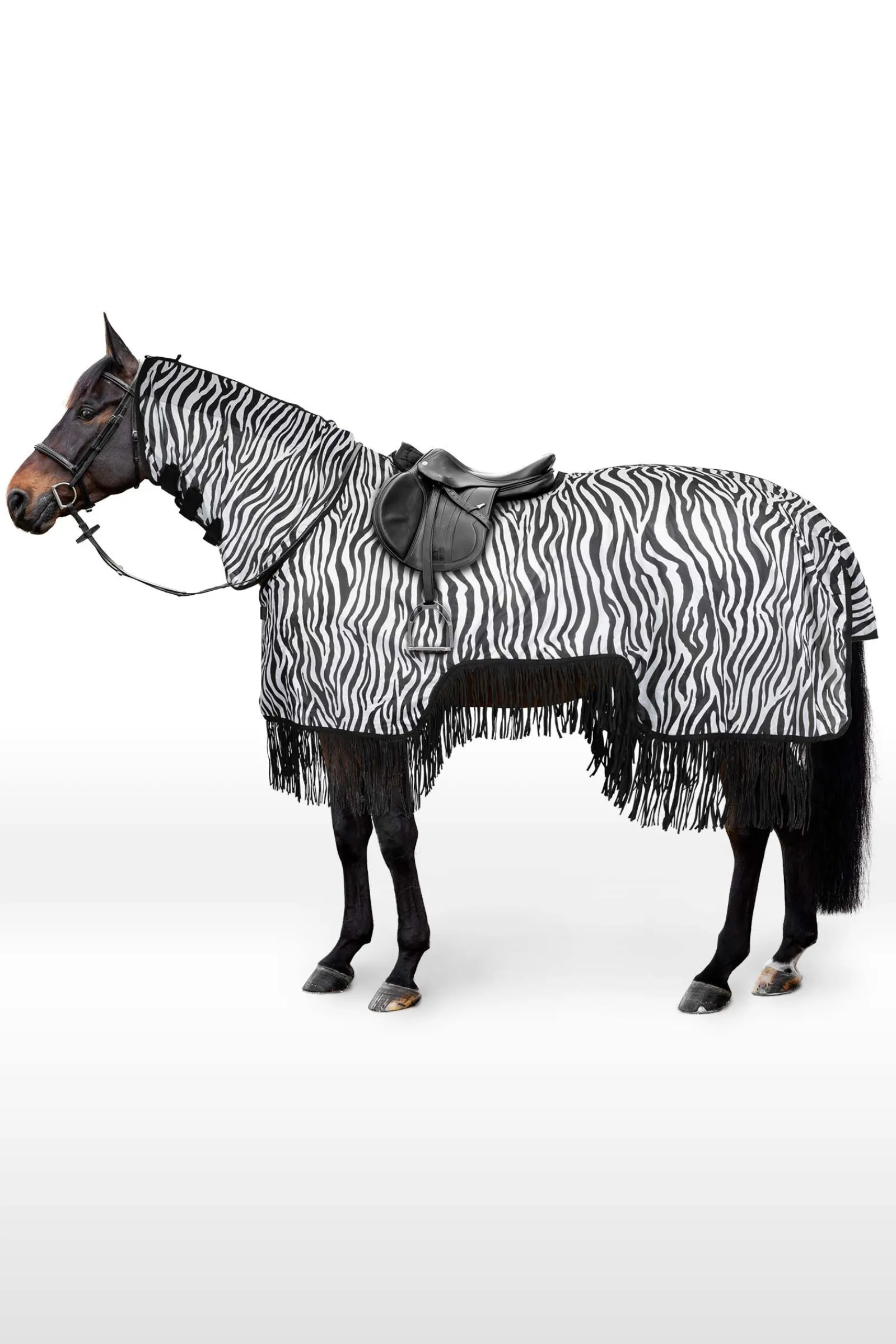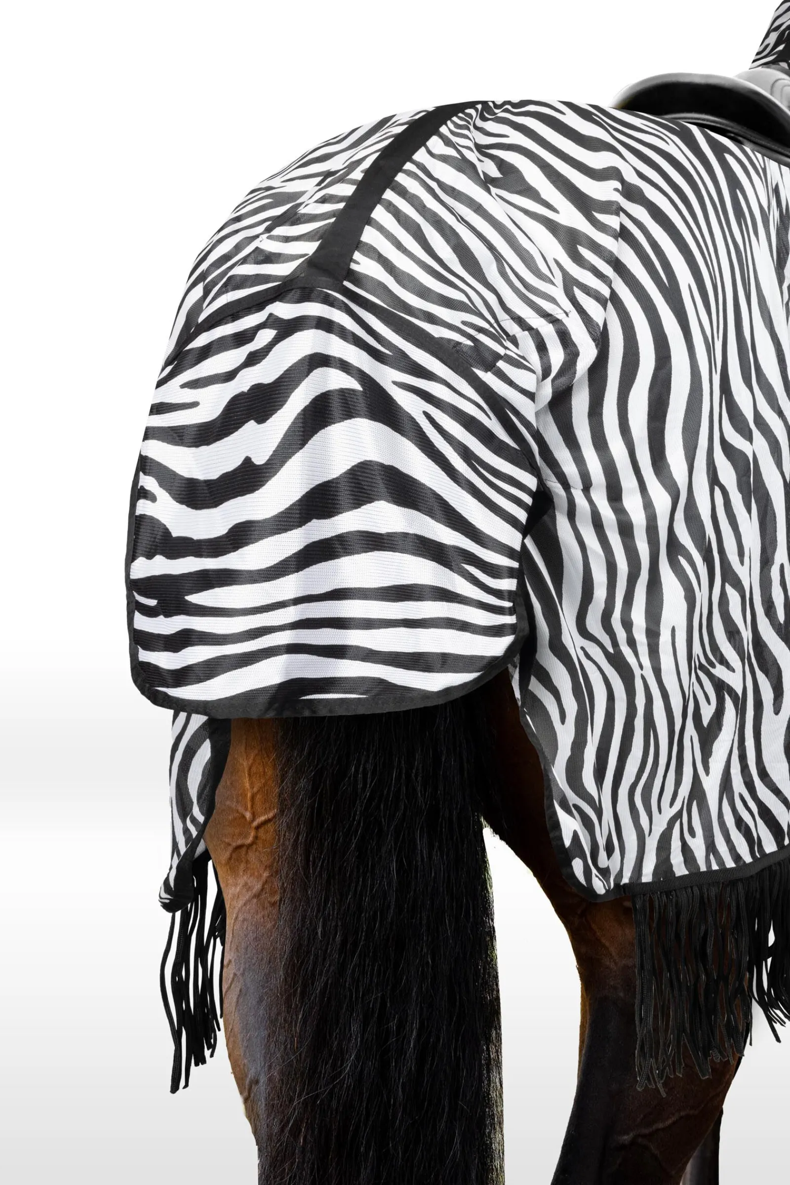 While we all love riding in summer, irritating flies and biting insects will certainly reduce the fun – for you and your horse. The Horze Defender riding rug is UV-protective and features a superb zebra print design which offers head to tail protection from annoying and biting insects. Zebra stripes are a highly effective deterrent against insects as the contrasting stripes have been shown to confuse and deter flies, helping to reduce insect bites and irritation.Fringes along the hem create a moving barrier that further deters flies, while the smooth lining along the extra-long neck and shoulder areas of this riding rug help to prevent friction.The fully breathable fabric ensures that your horse does not overheat, while the saddle shape cut-out and hook and loop-bridle loops offer security and an excellent fit, so you and your horse can ride on and enjoy the sunshine!