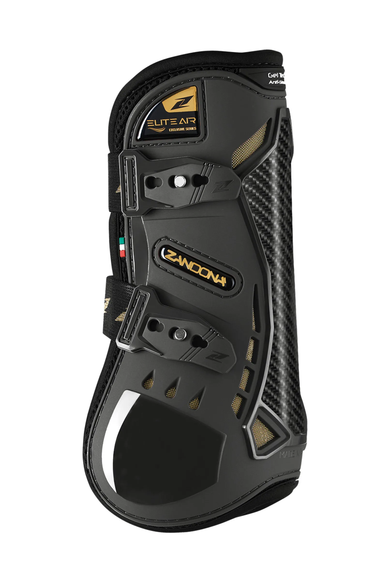 Det innovative senebelegget Elite Air er et luksuriøst, toppmoderne bakbeinsbelegg, som er utviklet for å være på et fabelaktig nivå for sportshester.Utviklet for å være den perfekte blandingen mellom maksimal beskyttelse, letthet og komfort. Belegget innehar den beste teknologien som nå er tilgjengelig på markedet.Den utvendige strukturen kommer med de spesielle nye innleggene Flex-Carbon Fiber (patentsøkt). De forbedrer beleggets evne til å beskytte uten å gå på bekostning av fleksibiliteten og en perfekt passform på hestebeinet. Dette gjør at hesten kan prestere enda bedre.Det innvendige fôret er laget av et ytre lag i 3D-mesh, et innvendig lag i perforert neopren og den velprøvde Gel-Tech-polstringen på områdene som er utsatt for slag. Belegget gir førsteklasses nivå av beskyttelse og optimal komfort, sammen med en uovertruffen pusteevne takket være det innvendige trekket COOLMAX® som fjerner like mye svette som 18 luftehull.Festene med den nye formen er enda mer komfortable, raskere og tryggere å bruke.Dessuten er belegget svært eksklusivt takket være de gylne feltene, og takket være designet og den italienske produksjonen viser de et helt nytt nivå av stil og kvalitet.