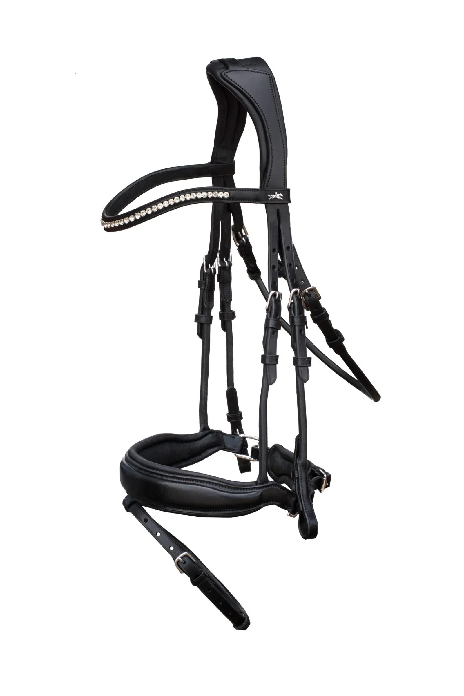 Eleganse møter funksjon: MALIBU er et edelt, rundsydd dressurhodelag med anatomisk formet pullback nesereim. Det kommer også med et unikt nakkestykke som er særlig utformet for hestens anatomi. Dette reduserer trykket markant på de sensitive områdene, sånn som kinnbein og nakke; samtidig gir det ubegrenset bevegelse for hestens ører. Hestens komfort er dermed maksimert.FS-XL er kun tilgjengelig i svart/sølv.