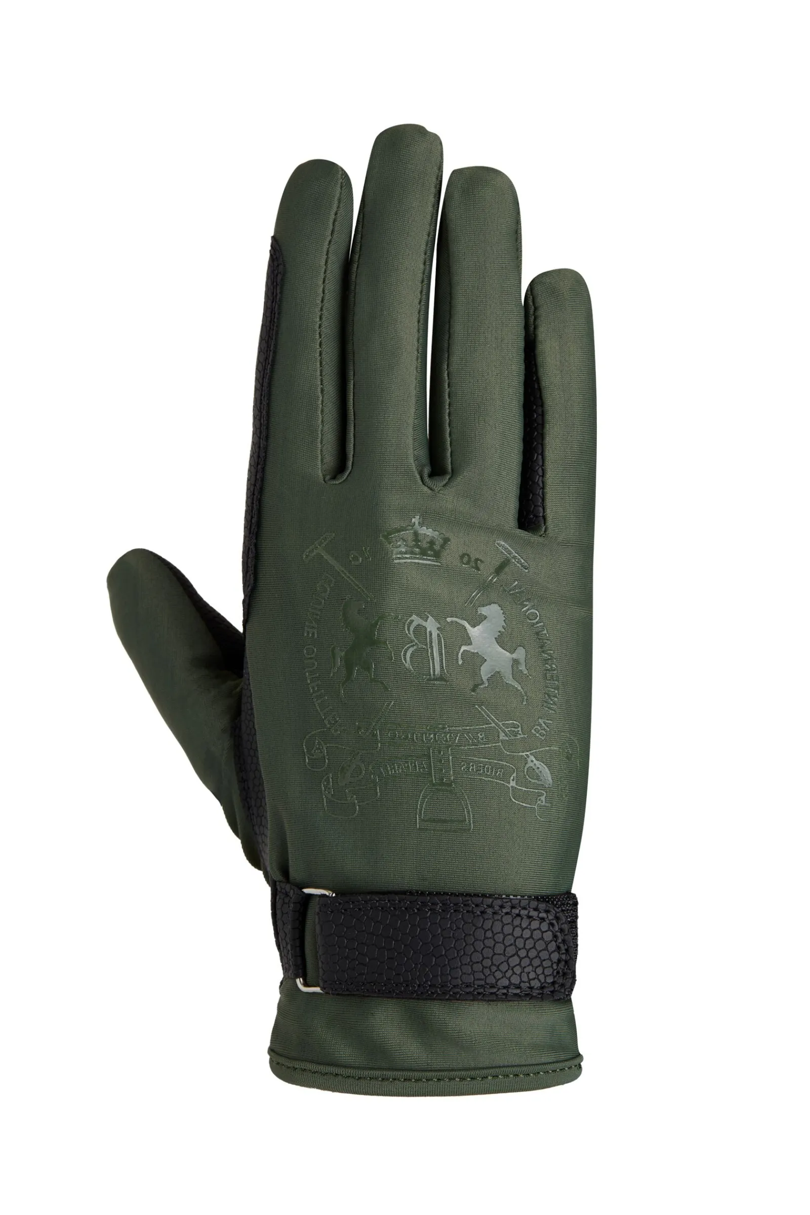 Disse tidløse og elegante hanskene kan brukes året rundt.Det elastiske stoffet på håndbaken gjør dem komfortable å bruke, mens stoffet på håndflaten sikrer et godt grep om tøylene.En justerbar borrelås rundt håndleddet fikserer hansken der den skal være.Designet er dekorert med et pent varmepreget logo på håndbaken på begge hender.