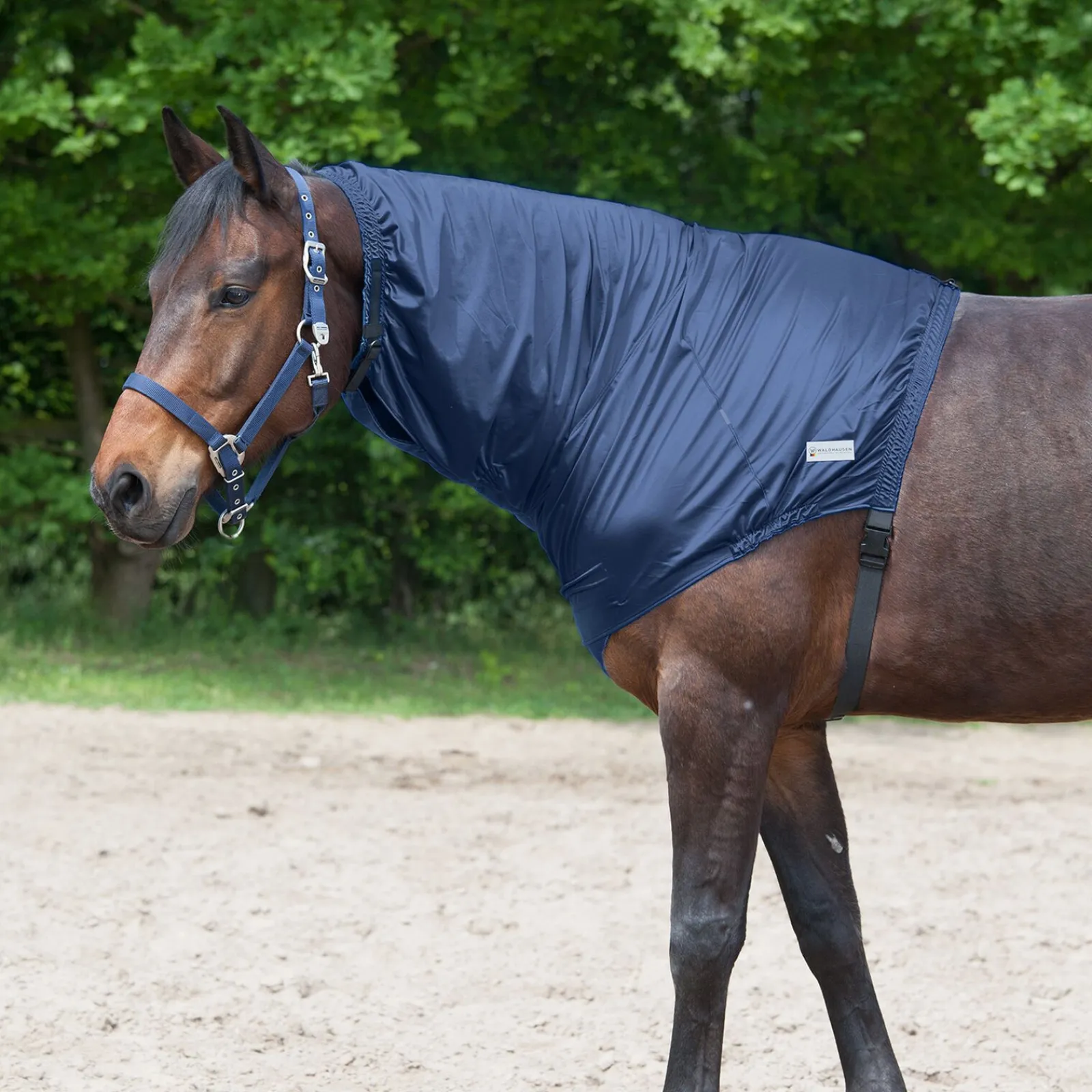 Sikker beskyttelse for manen og for område utsatt for kløe fra manke til hode.Laget av pustende, funksjonelt fibermateriale.Magestroppen sikrer at den ligger godt på plass.