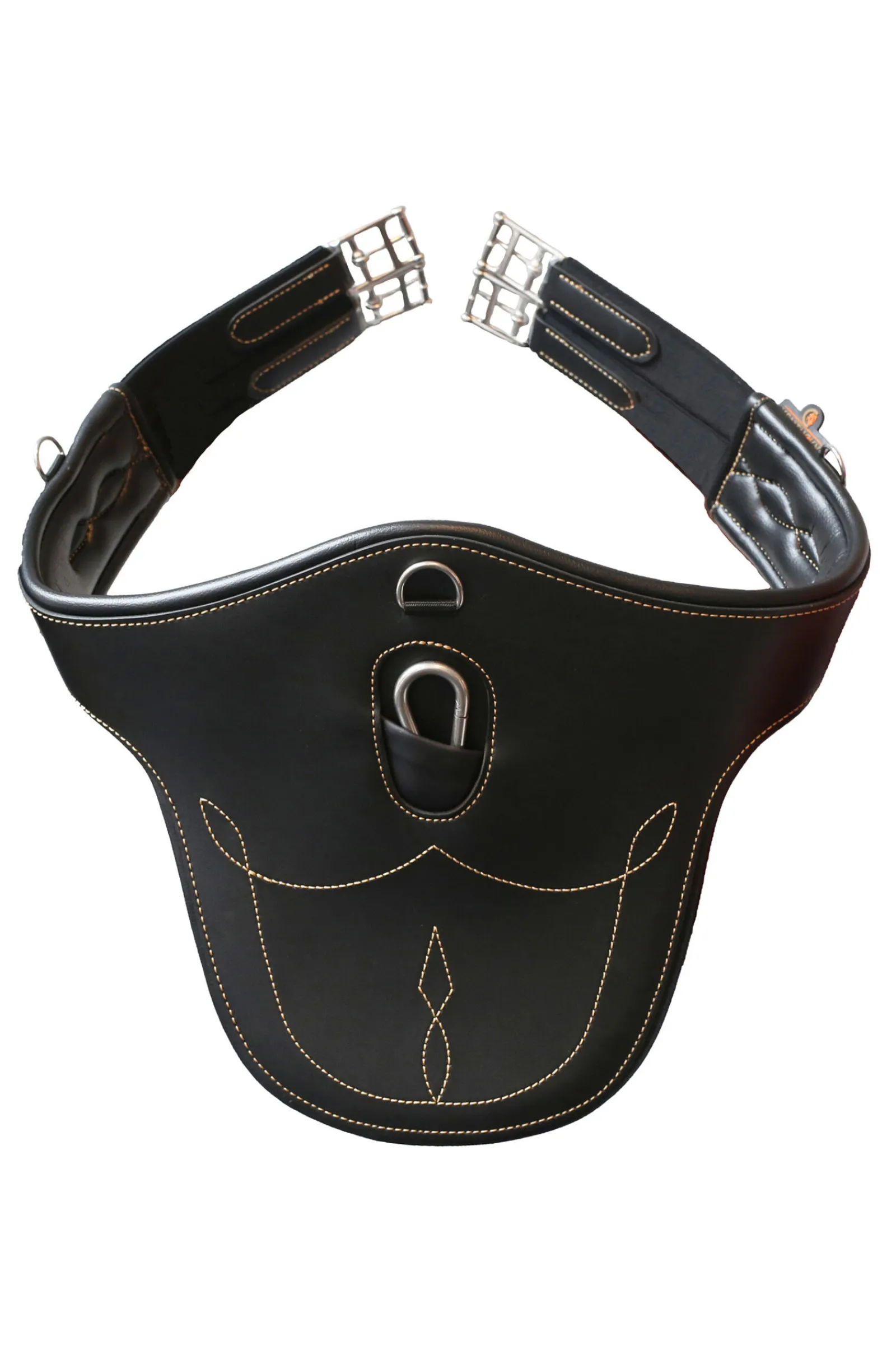 Kentucky Horsewear spranggjorden er laget av meget sterkt lær som gjør den holdbar og lett å rengjøre. Den tåler både spark og skraper, og absorberer støt takket være den støtabsoberende gelen.Spenner og D-ringer er laget av rustfritt stål. Spennene er festet til en solid og holdbar dobbel strikk. D-ringene på siden og i midten kan brukes til å feste hjelpetøyler.