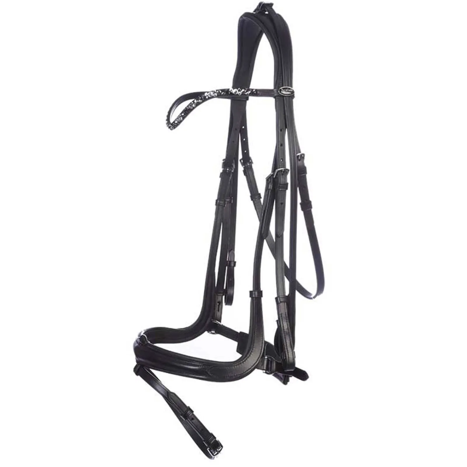 Et ekstremt praktisk kominasjonshodelag.Med elegant panneåbnd med hvite, grå og svarte steiner.Anatomisk formet engelsk nesereim med avtakbar flash-reim.Valgfrie, avtakbare kinnstykker så det kan kombineres til et kandarhodelag.Kombinasjonshodelaget kommer også med to par tøyler.En er normale kandartøyler uten stoppere, og de andre er tynne, gummidekte tøyler.