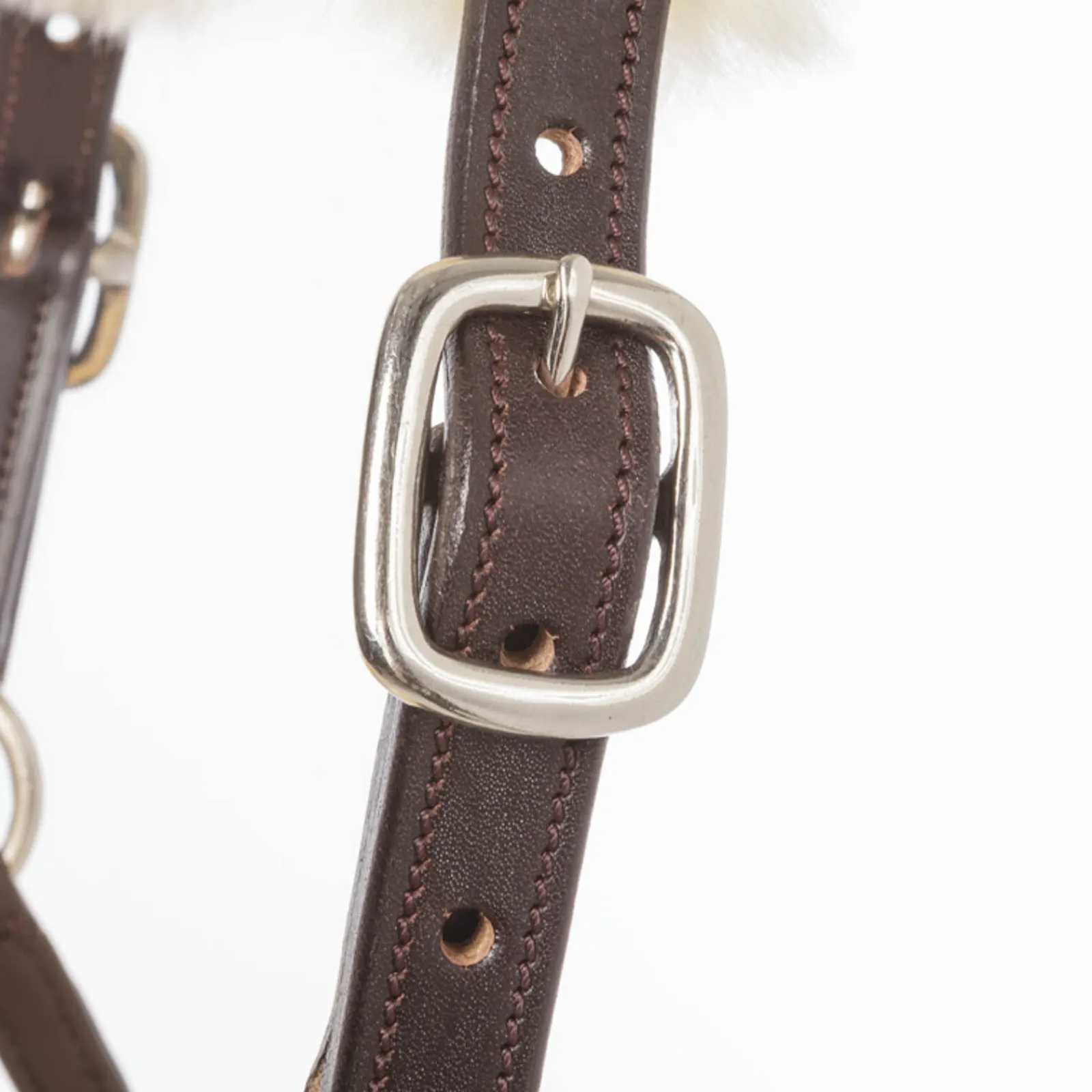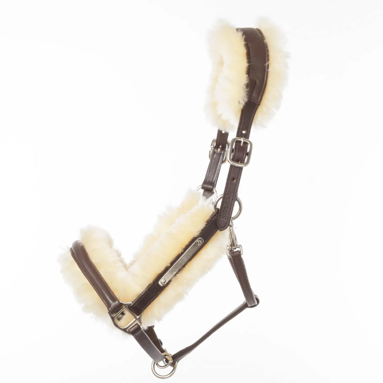 Stilig grime med mykt lær og ekte saueskinn på nakken, nesen og kinnstropper.Saueskinnet kan fjernes med borrelås, slik at du kan vaske det.Grimen kan justeres på begge sider, og ved kinnet for ideell passform.En avtakbar plakett i sølv på venstre sidestykke som kan graveres, slik at grimen kan personaliseres.