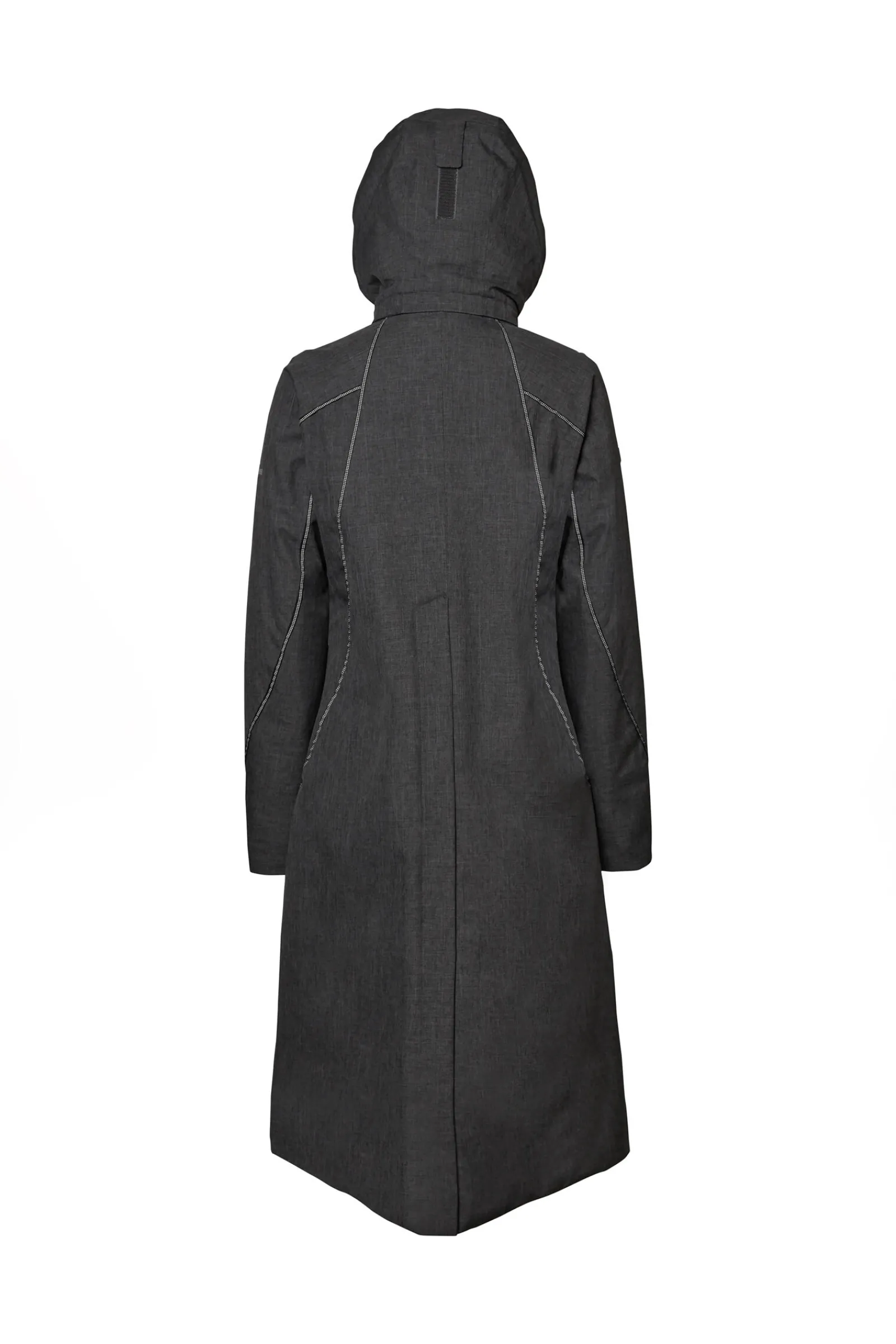 Alicia er en lett, fôret frakk med avtakbar hette.Den vanntette og vindtette frakken har en feminin passform som gir en fin form til figuren..Det er reflekterende detaljer på ermene, bak og foran.Dette gjør deg også godt synlig i mørket.Med toveis glidelås og lang ridesplitt bak som kan åpnes og lukkes med trykknapper er denne frakken ideell for ridning.For oppbevaring av godbiter og mobilen har du frontlommer med glidelås, eller en innvendig lomme i mesh-stoff.
