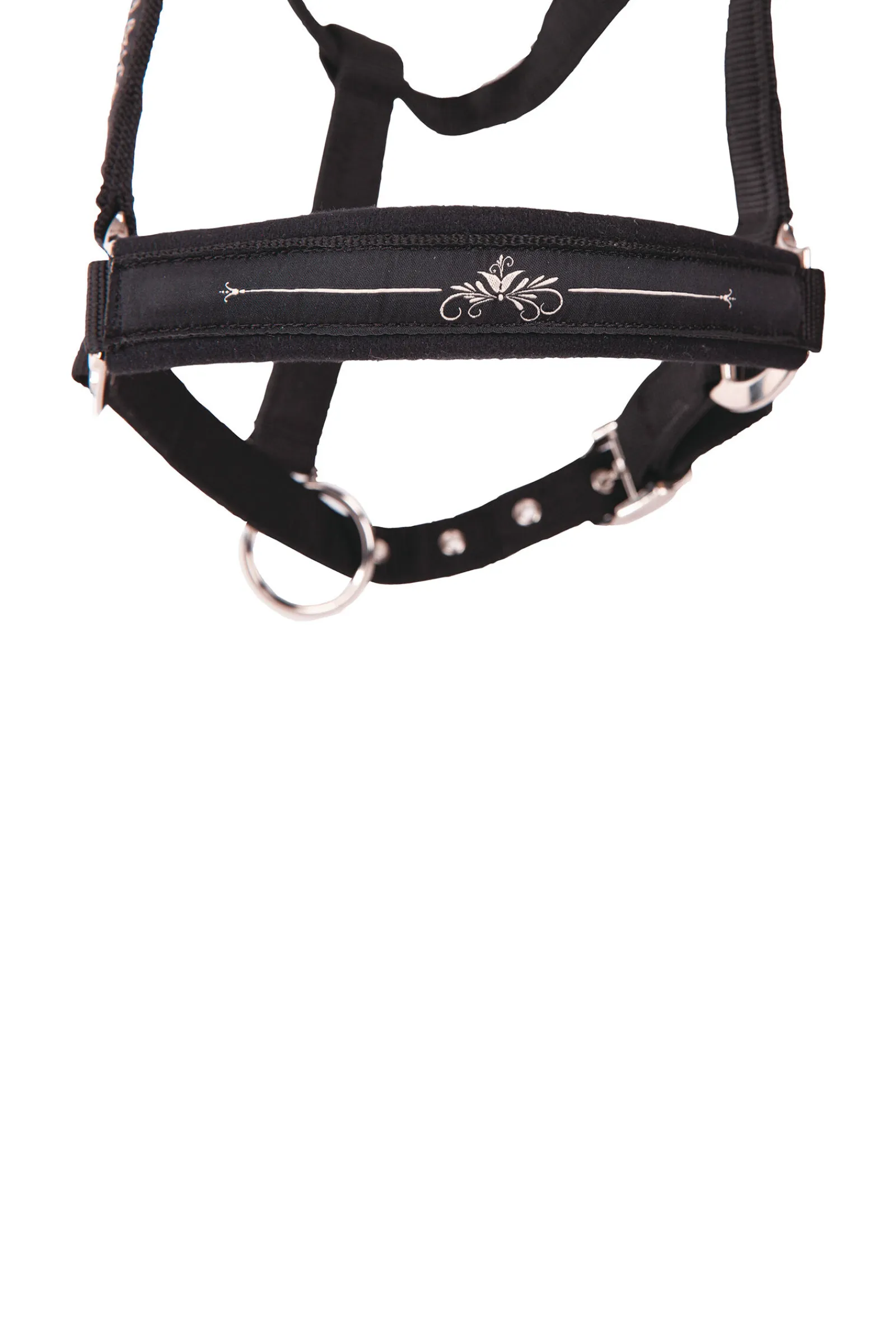 Solid coloured Halter «Rosi», silver coloured fittings, crown part and noseband softly padded, USG SPORTS logo and rose print on noseband.