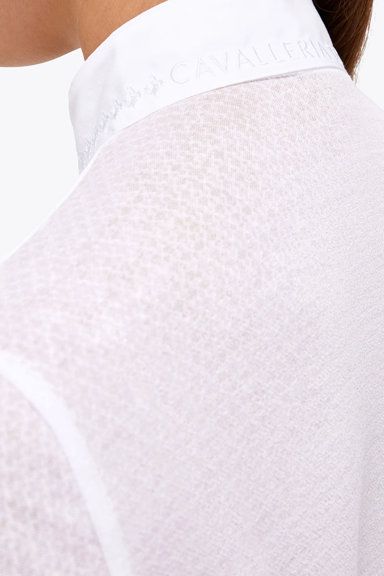 Det bi-stretch tekniske stoffet i denne langermede stevneskjorten kombinerer komfort, eleganse og funksjonalitet. Pusteevne, antibakterielle egenskaper og rask tørking gjør plagget perfekt for konkurransebruk. Skjorten lukkes med en rad skjulte knapper og har et plissert brystparti. Den har en hvit oppstående krage dekorert med en liten brodert logo.