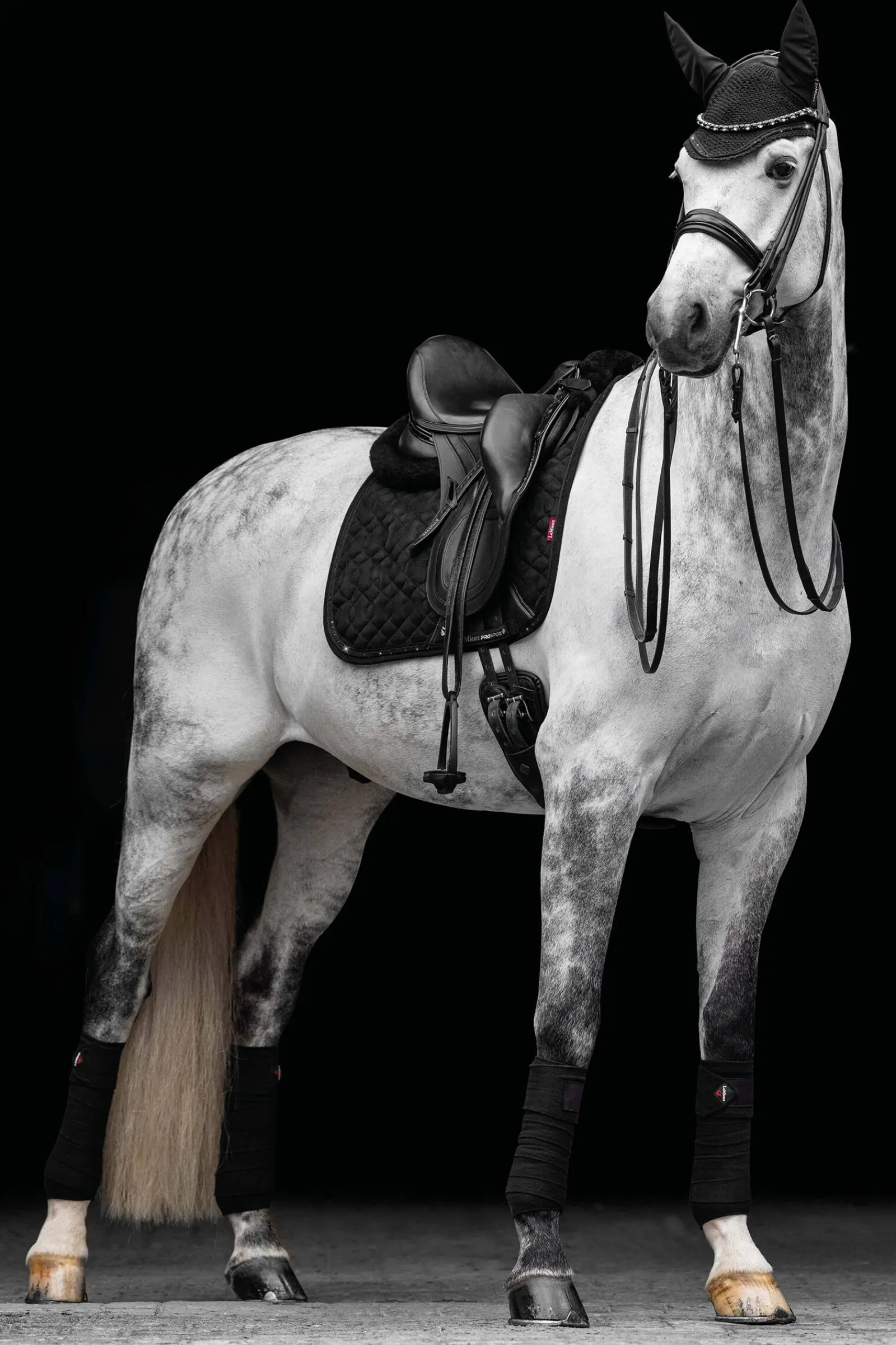Kommer med en luksuriøs, myk semsket overside og et nytt, sofistikert, vattert mønster. Crystal Suede Close Contact sjabrak fra LeMieux gir et slankt og profesjonelt utseende til salen din. For et ekstra spesielt preg har LeMieux laget denne sjabraken med flott glitter og flettede kantdetaljer, noe som gir en nydelig utseende som skiller seg ut. Sjabraken er spesielt formet for å gi en sikker passform under dressursaler, enten du skal ri på stevne eller bare trene hjemme i stallen. Den kommer også med den temperaturregulerende innsiden i bambus. Den trekker umiddelbart vekk svette og fukt fra hetsens hud for å holde den komfortabel i all slags vær. En annen fordel med bambus er at det minimerer friksjon, noe som gjør denne sjabraken veldig god til hester med sensitiv hud. Denne sjabraken gir optimal komfort med den ultramyke innsiden, beskyttet gjordområde i PU-lær og en høyere profil ved manken. I tillegg kommer gjordfestene med innvendige låsehemper for å gi flere valgmuligheter for innfesting. Lag et matchende sett med Crystal ørehette.