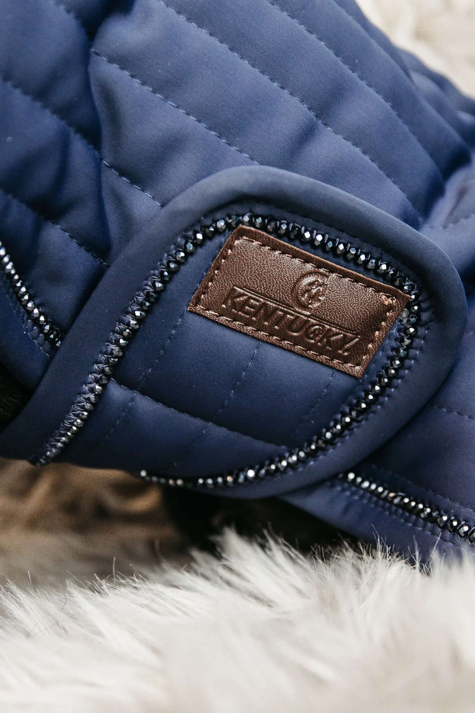 Dette slående hundedekkenet er laget for å matche vår kolleksjon av sjabraker og ørehetter til hester. Det har fyll på 160 gram og kommer med fôr av kunstig kaninskinn for ekstra komfort. Det lager små luftlommer som fanger og holder på hundens kroppsvarme. Det myke fôret polerer også hundens pels, og det kunstige saueskinnet på nakken gir komfort og varme. Halsen kan brettes framover for ekstra beskyttelse. Dette stilige dekkenet har en unik, horisontal vattering og er laget av pustende materiale (43% nylon, 43% polyester og 14% spandex). Det flotte kantbåndet laget av perler er svært iøynefallende! Det er borrelåslukking foran, dekket i kunstig lær, samme som lukkingen rundt magen.