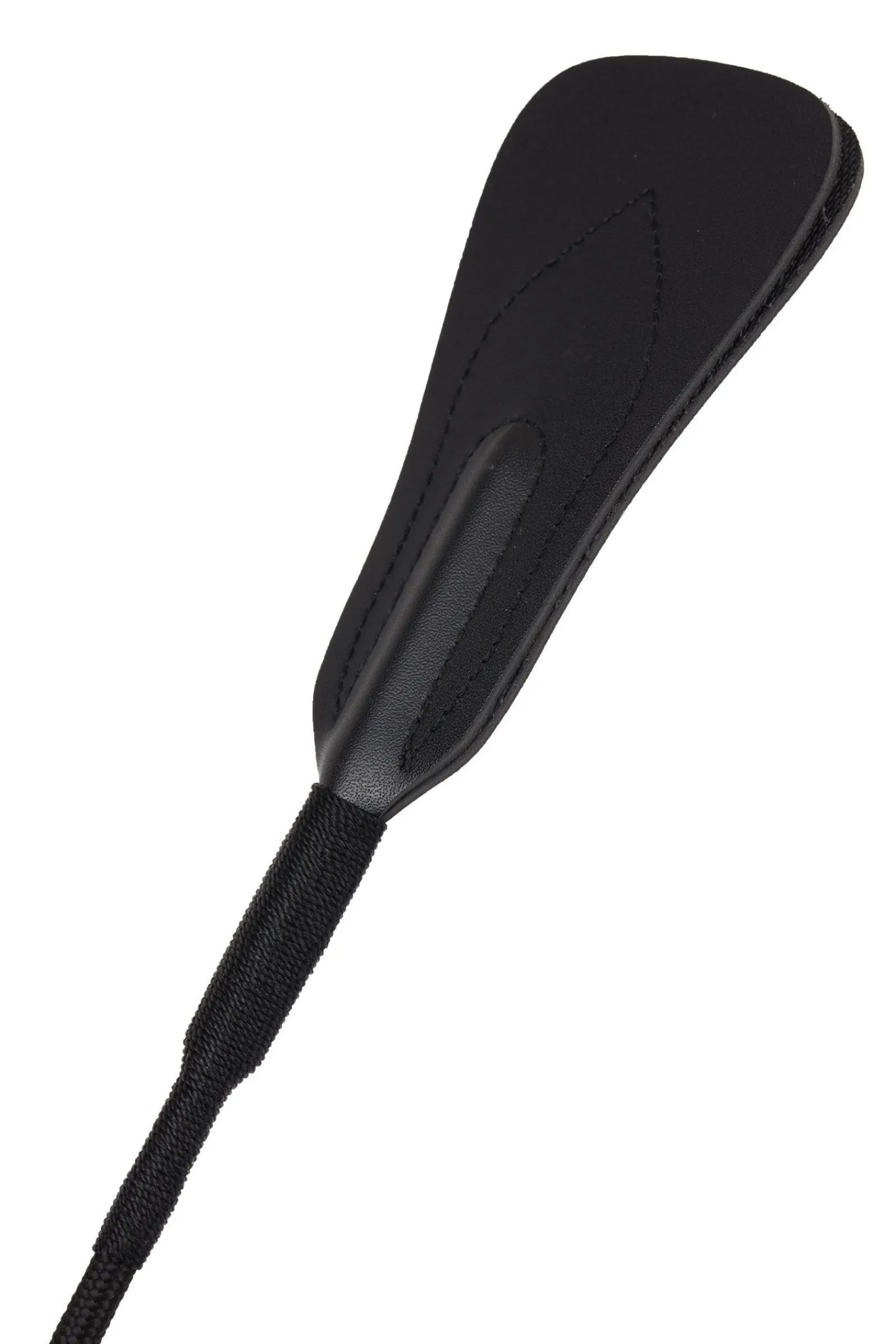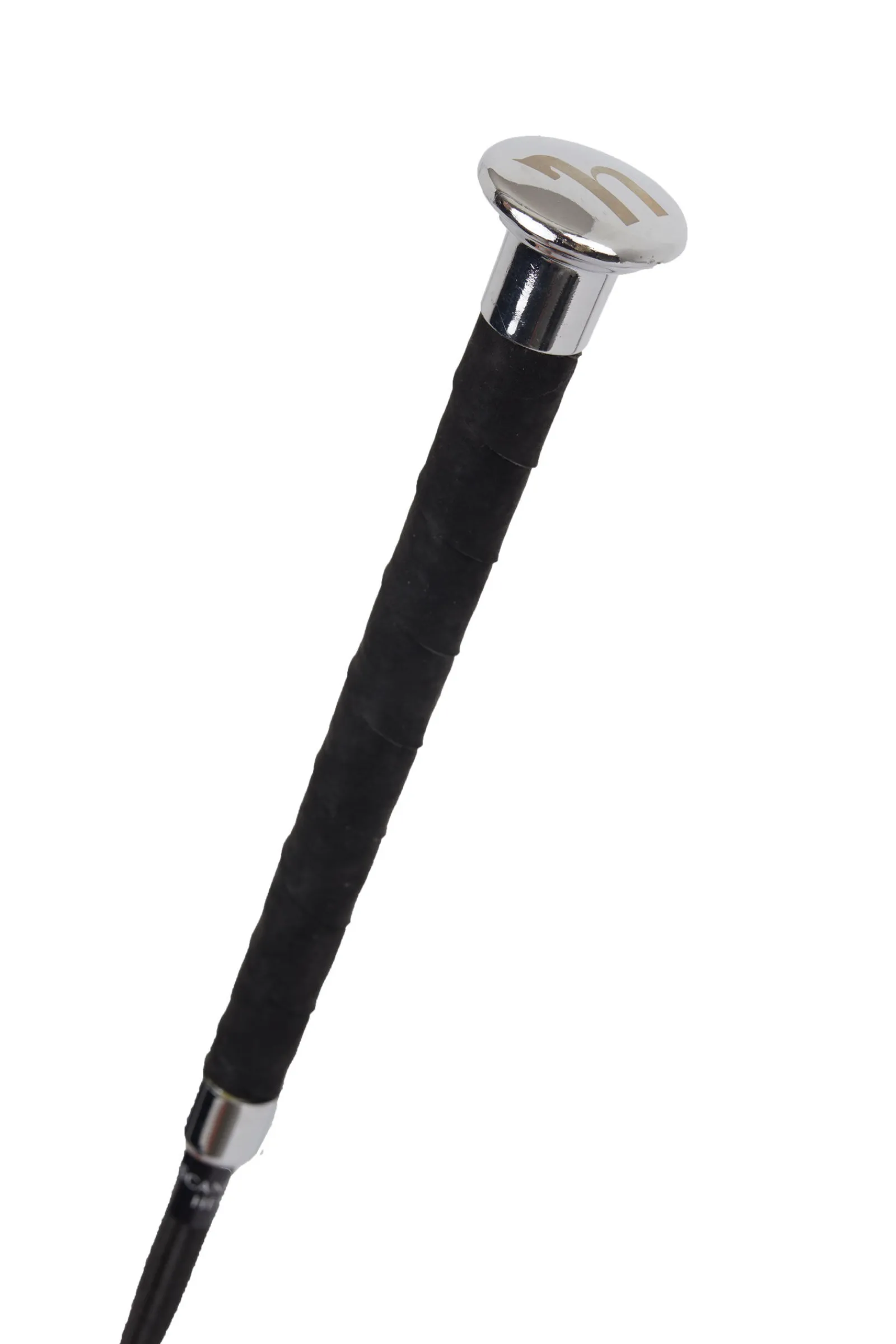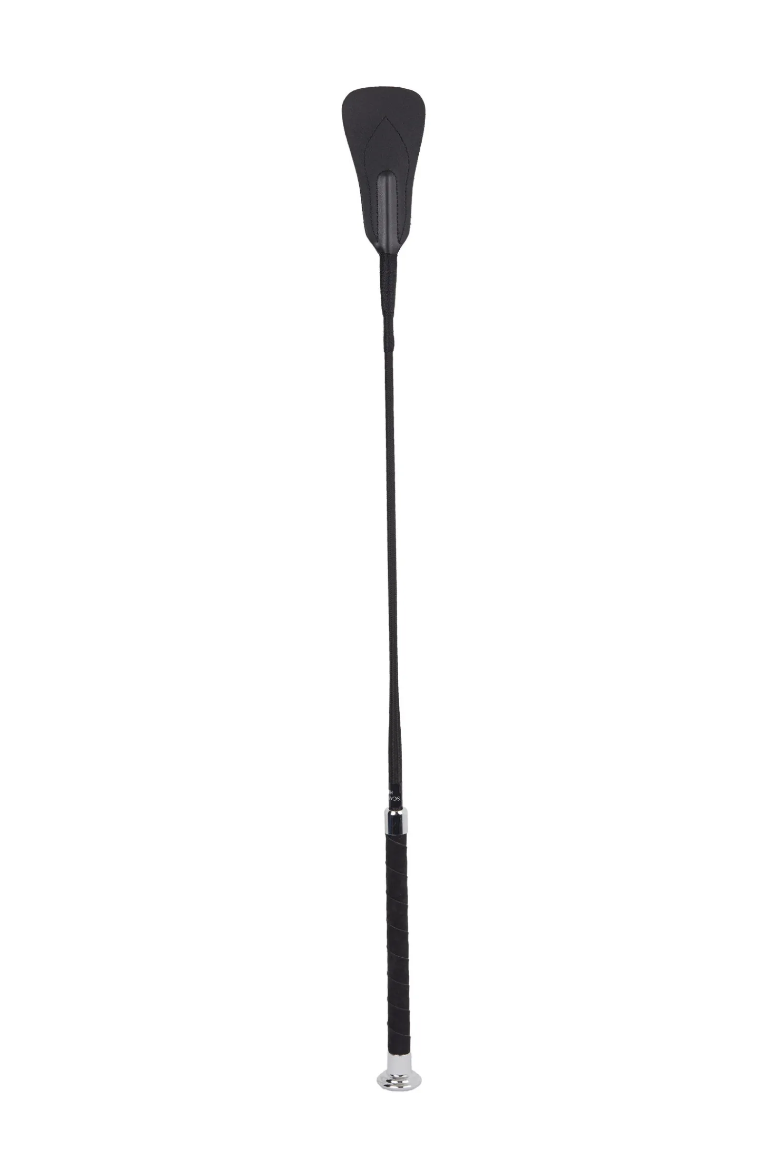 Ridepisk med flettet håndtak. Skinnflapp. Nylon skaft. Metallhette med logo.