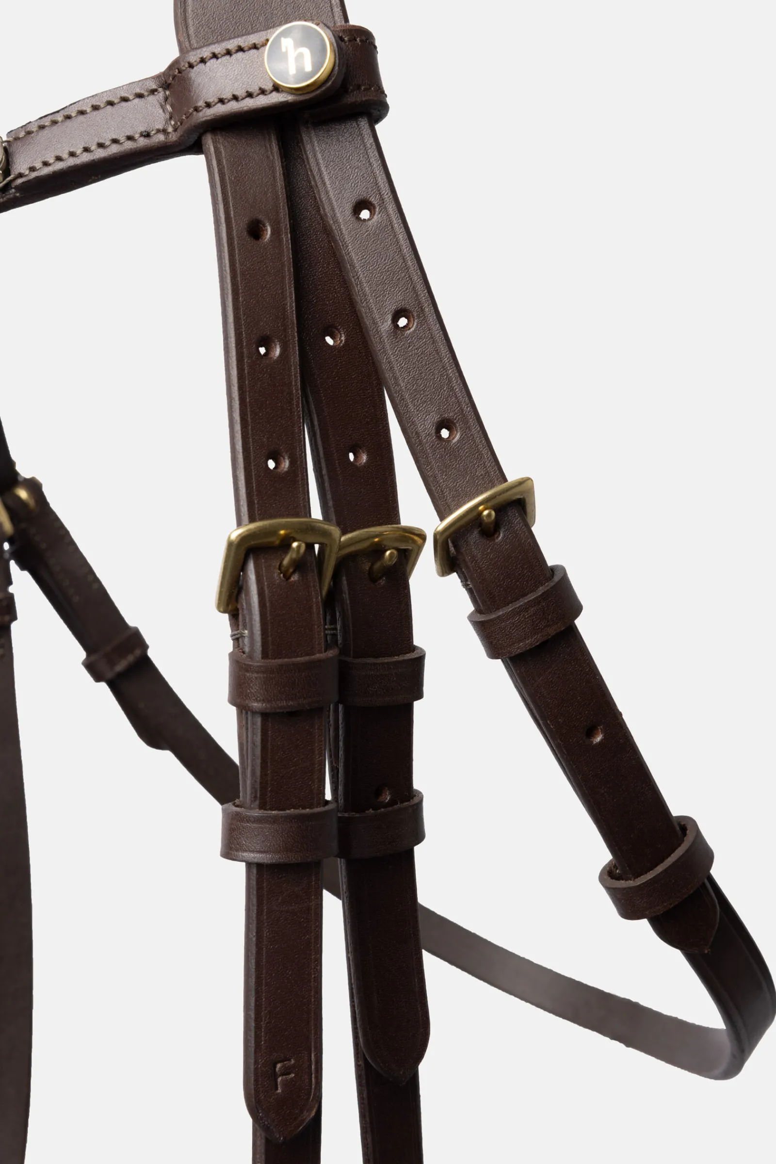 Horze Somerset hodelag har en anatomisk utskjæring og er polstret på nesen og nakken, noe som gir hesten din den høyeste komfort.Det U-formede pannebåndet med glitrende krystaller gir et elegant utseende.Praktisk trykknapp gjør det enkelt å skifte hvis du ønsker et enklere pannebånd.Metallspenner passer det myke nappa-læret perfekt.