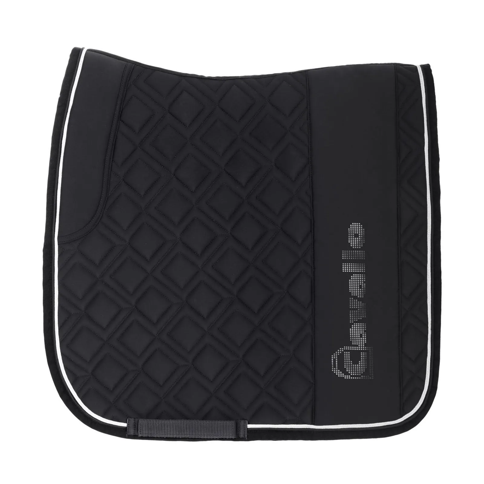 Den sporty, funksjonelle sjabraken er laget av et elastisk softshellmateriale.Det utvendige stoffet er laget av softshell, noe som er særlig lett å rengjøre.Hele sjabraken har dobbel diamantvattering.Begge sider har en vertikal, glatt, ensfarget stripe på ryggen.På stripen er en perforert, stor, vertikal Cavallo-logo.Det er et glinsende, reflekterende materiale under hullene til Cavallo-logoen.Forsterking foran er laget av memory foam, noe som sikrer en optimal posisjon under salen.Sjabraken er innrammet av et hvitt bånd med en smal sølvstripe.Den hurtigtørkende og fukttransporterende innsiden i mesh er særlig skånsom mot pelsen, og gir maksimal komfort.En fôring som holder formen gjør at sjabraken ligger perfekt på hestens rygg.