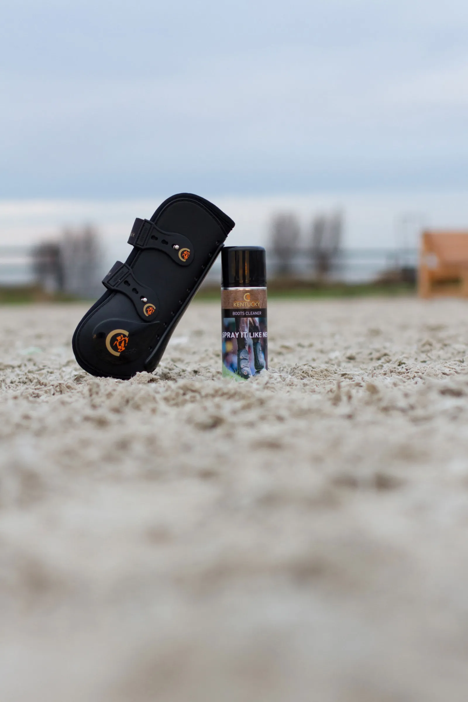 Kentucky Horsewear støvelspray er en svært effektiv rengjøringsspray som også vedlikeholder alle typer beleggg laget av TPU eller PU.Spray på tørre, møkkete belegg og bruk et tørt håndkle for å rengjøre overflaten. Beinbelegg-rensen gjør at dine brukte belegg ser nye ut igjen, med en skinnende finish klare for stevner.