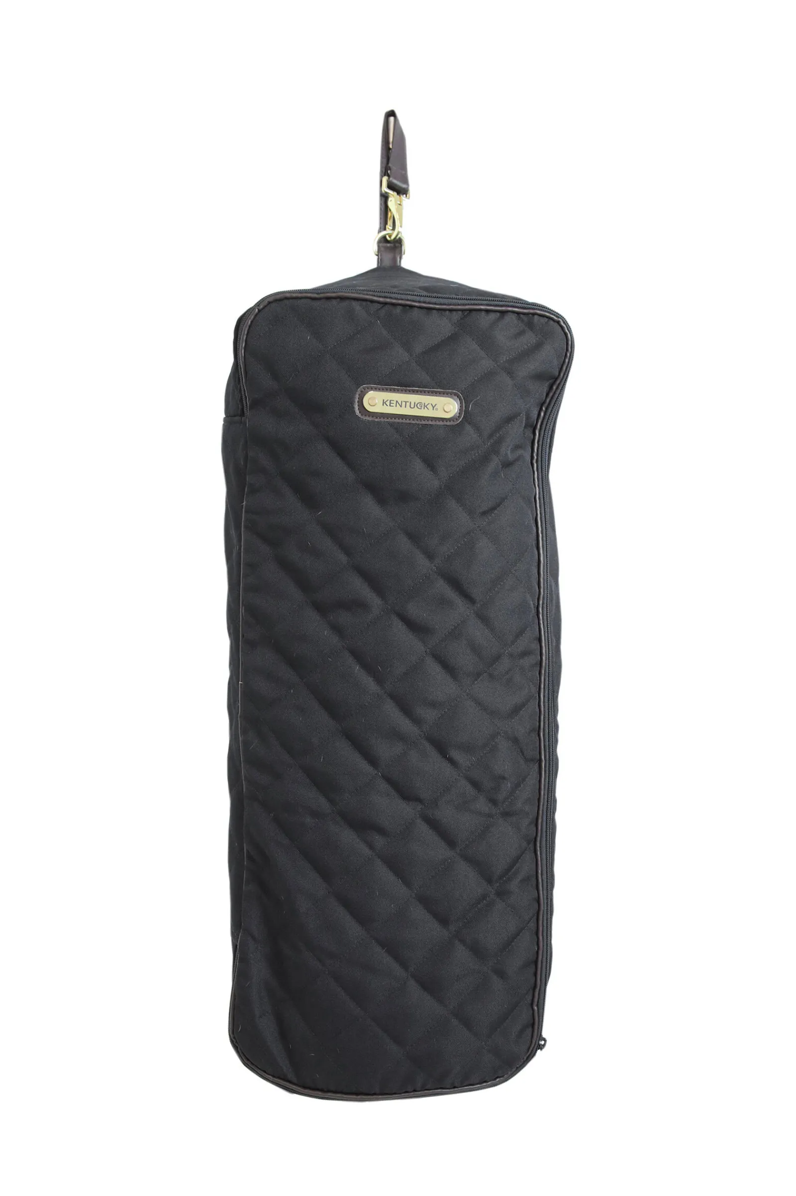 The Bridle Bag has artificial rabbit skin on the inside to avoid scratches on the leather.You can easily attach your bridle to the hook on the inside and the name tag on the front can be personalized. The Bridle Bag can be attached to anything thanks to the hook & ring on top. It has the same diamond quilting that the Kentuck stable set (curtain, guard, head protector)And rugs! Therefore, this Bridle Bagis the perfect addition to you Kentucky show look.