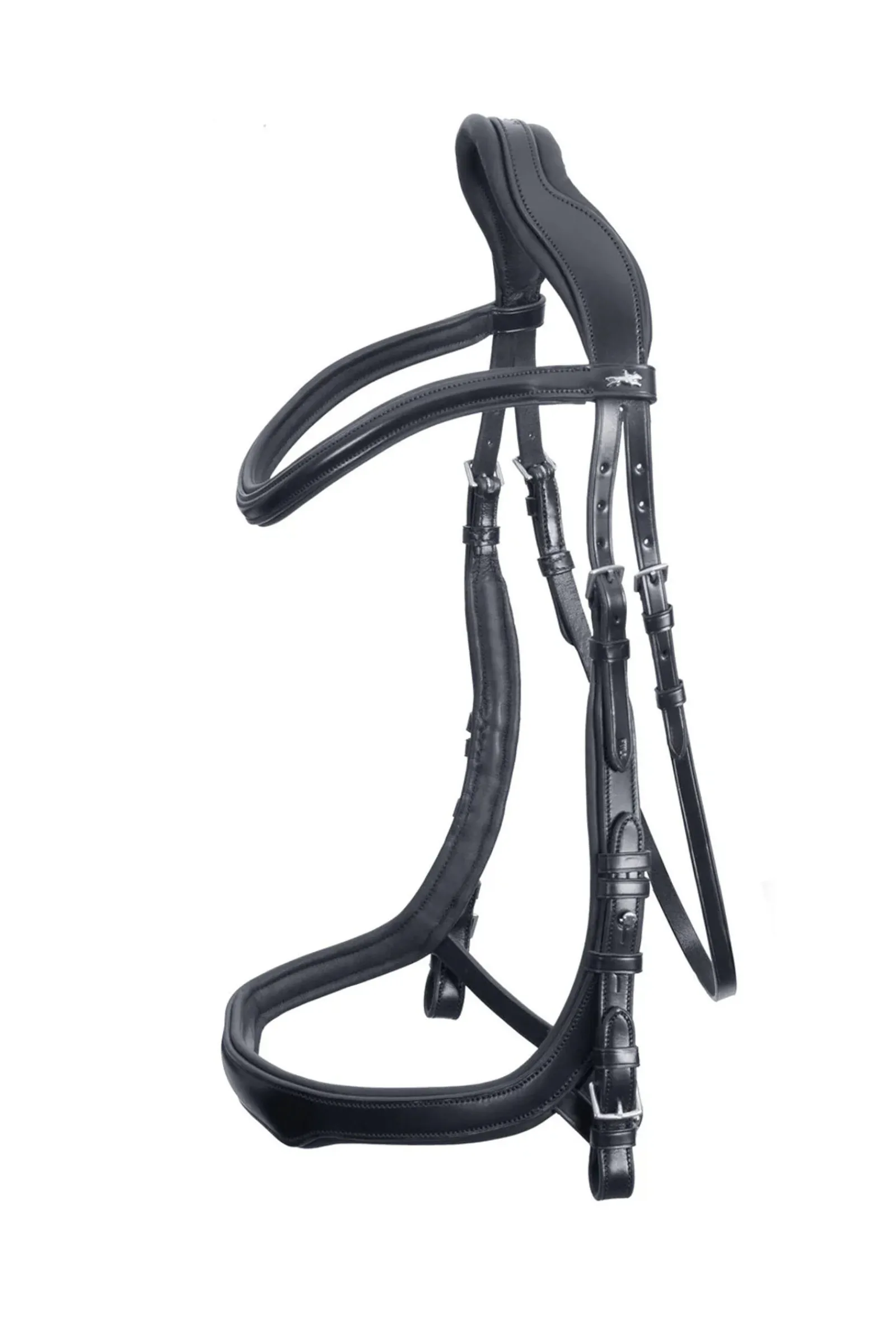 Det spesielle, anatomiske hodelaget Equitus Delta fra Schockemöhle Sports overbeviser med den maksimale brukskomforten, som møter de høyeste standarder når det kommer til passform. Samtidig som den buede nesereimen unngår ansiktets hovednerve, er det også et ordentlig blikkfang. Det mykt polstrede nakkestykket og det brede, buede pannebåndet begrenser ikke hesten din, og unngår ubehagelig trykk på det sensitive hodet til hesten. Takket være den forbedrede knappenaglen kan hodelaget enkelt justeres. En funksjonell modell i moderne design!