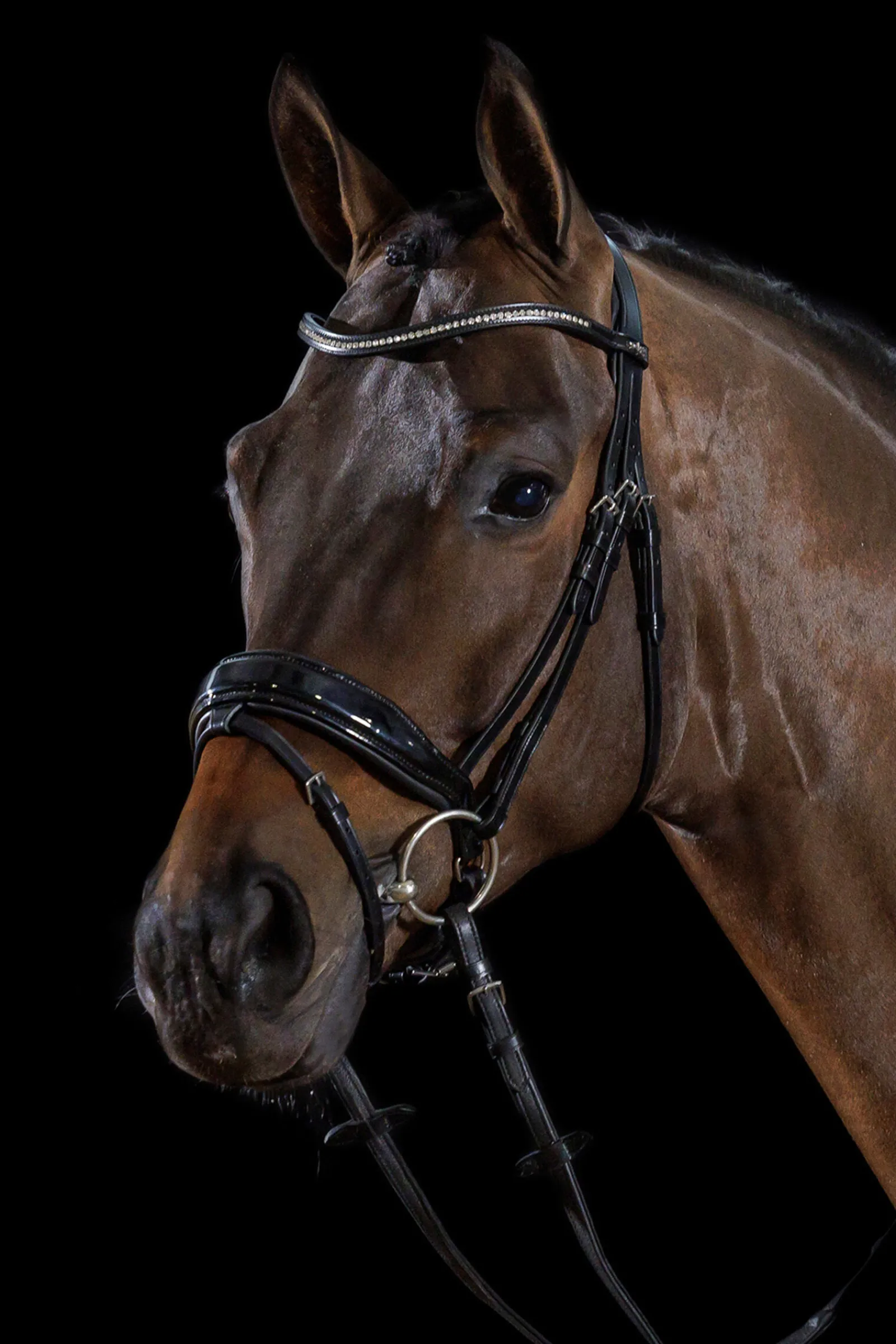 STANFORD S kombinerer funksjonalitet og edelt design: Hodelaget med anatomisk formet pullback-nesereim har et unikt nakkestykke. Dette er særlig formet etter hestens anatomi og gir ubegrenset bevegelsesfrihet til ørene. På grunn av reduksjon av trykk på sensitive områder rundt kinnbein og nakke er hestens komfort betydelig forbedret. For en ekstra spesiell framtoning er STANFORD S utstyrt med et farget pannebånd med blå eller røde Swarowski®-krystaller. Den røde versjonen har også spenner i rosegull – en ekstra spesiell detalj!