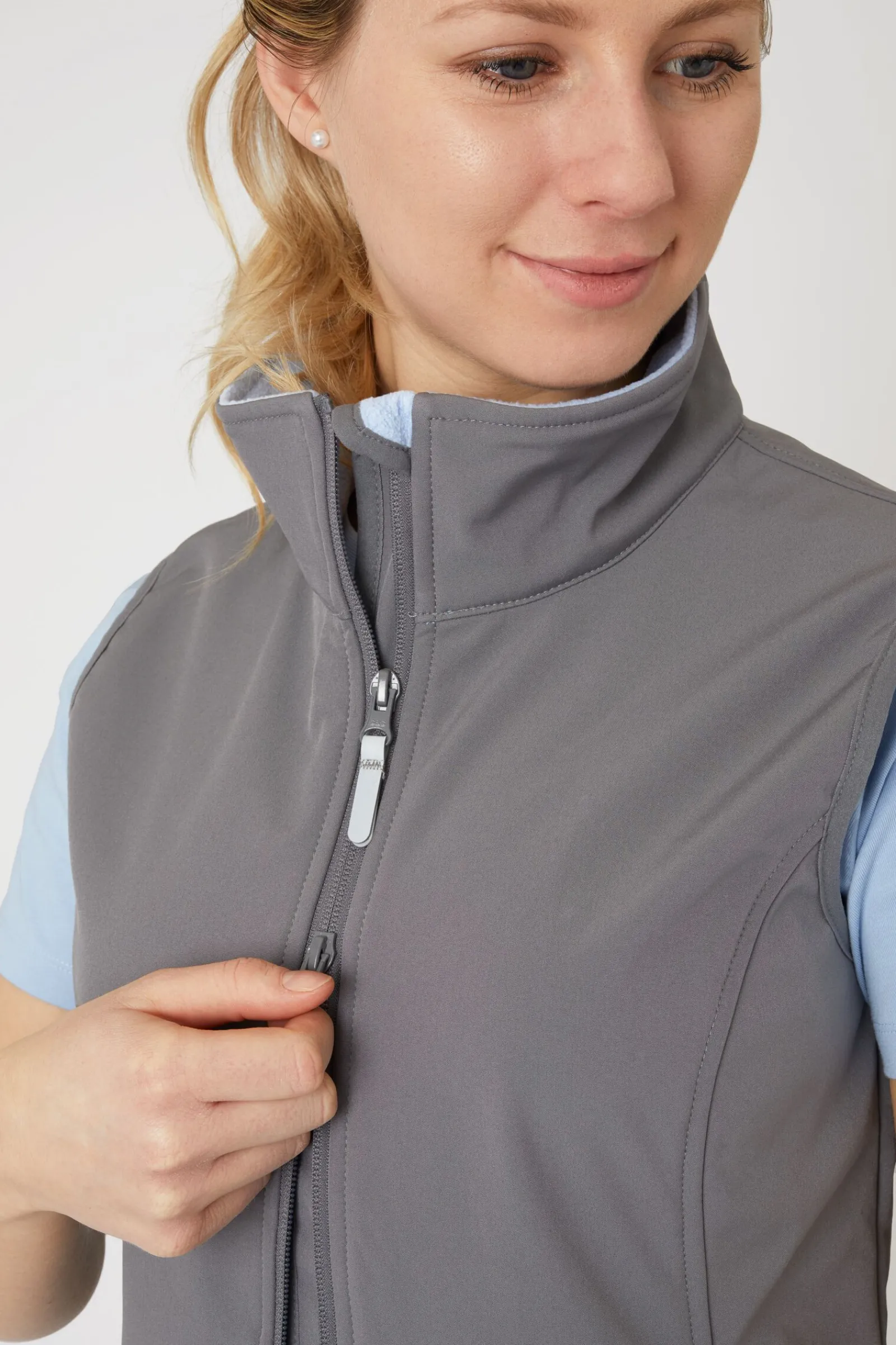 Denne funksjonelle softshellvesten til dame med innside myk fleece og kontrastfarge er det perfekte valget å bruke som et ekstra lag, eller på de varmere vårdagene.Det vanntette stoffet og den lett stående kragen er praktisk i noe ubehagelig vær.Toveis glidelås foran gjør at den passer perfekt til ridning, og de romslige glidelåslommene gjør at du trygt kan oppbevare nøkler og telefonen din når du er i stallen.Drasnoren på innsiden i livet bak gir en flott figur hvis den strammes.