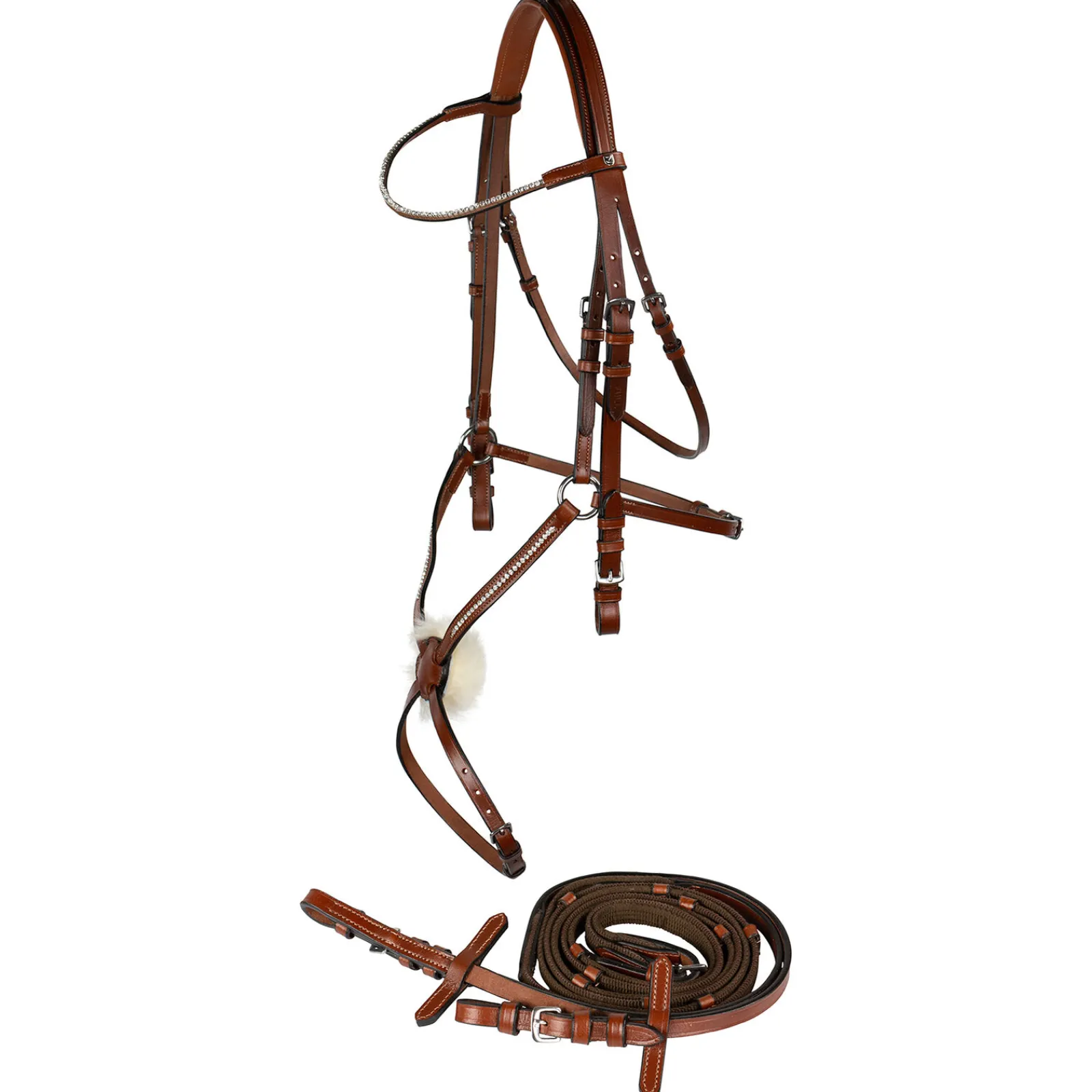 Horze Valencia hodelag med meksikansk nesereim er et klassisk valg for feltritt eller sprang, og denne kommer i en spesiell stil. Nesereimen i åttetallsfigur er utsmykket med krystaller som matcher det rette pannebåndet, og gir et helhetlig utseende. En myk plate fôret med ekte ull beskytter nesen, og du unngår gnag. Nyt dette elegante hodelaget med matchende tøyler.