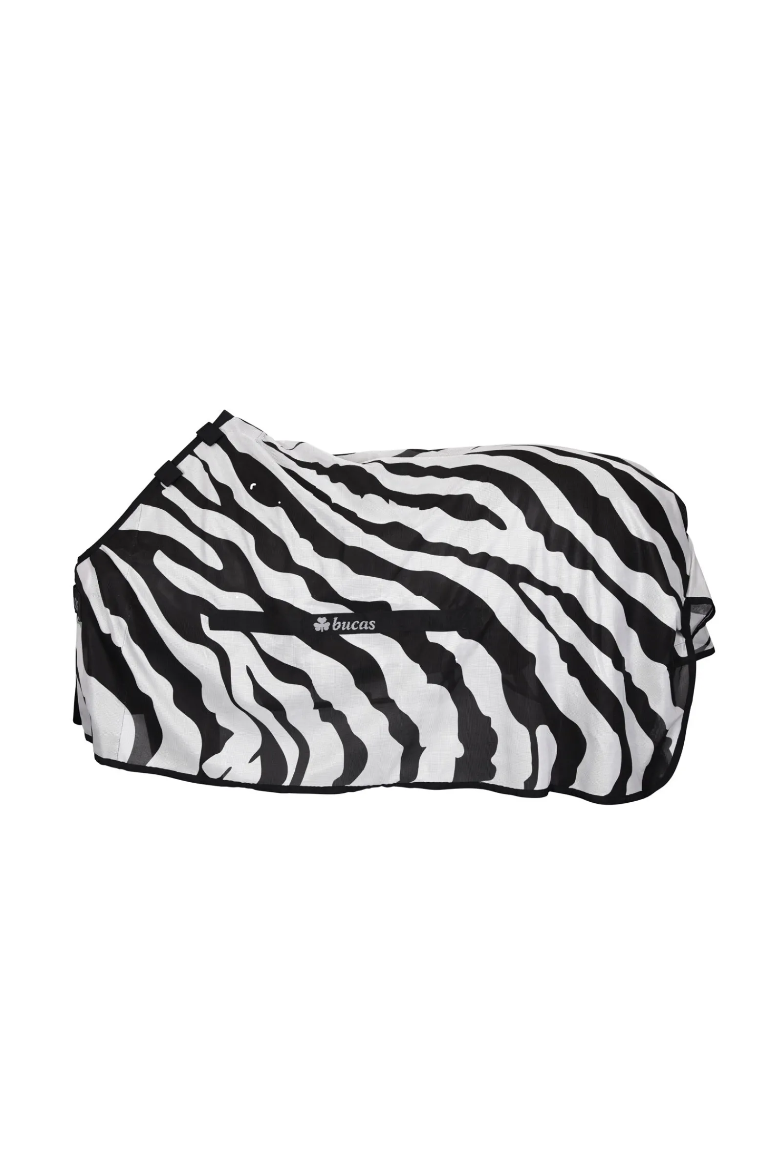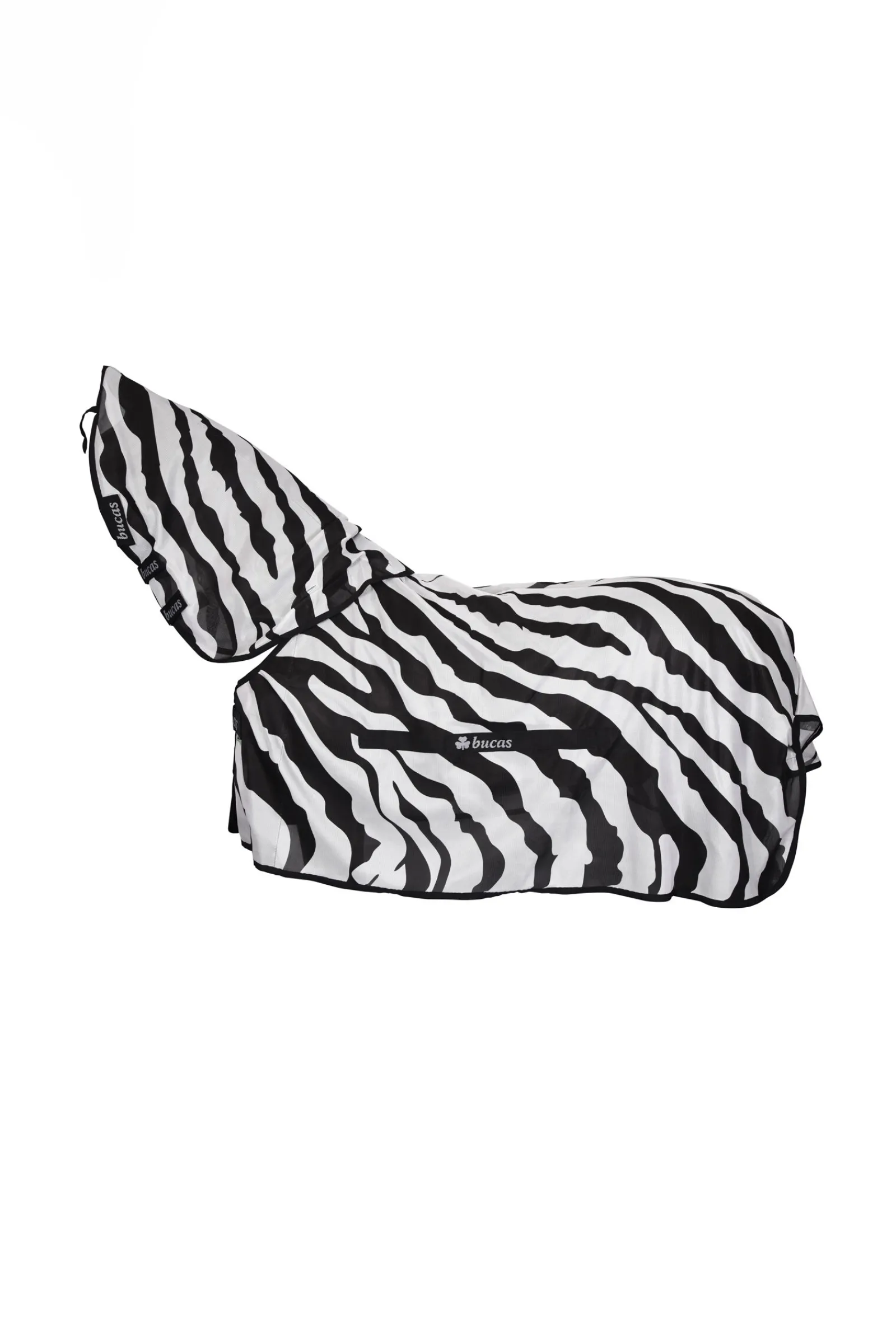 Buzz-Off Zebra-serien av flue- og insektprodukter er laget av et spesielt utviklet lettvekt finmasket stoff med zebramønster. Forskning har oppdaget at fluer hater zebrastripene, fordi de finner dem forvirrende. De blir desorienterte av kontrasten mellom de svarte og hvite stripene, sammenlignet med ensfargede flater, og derfor holder de seg unna! Buzz-Off Zebra-dekkenet med full hals gir beskyttelse for hestens kropp og nakke. Nakken hjelper til med å beskytte manen mot fluer, og et elastisk pannebånd hjelper med å holde halsstykket på plass mens hesten beiter. Magestykket beskytter hestens mage og hjelper til med å holde dekkenet på plass. Den store haleflappen beskytter halen mot fluer.