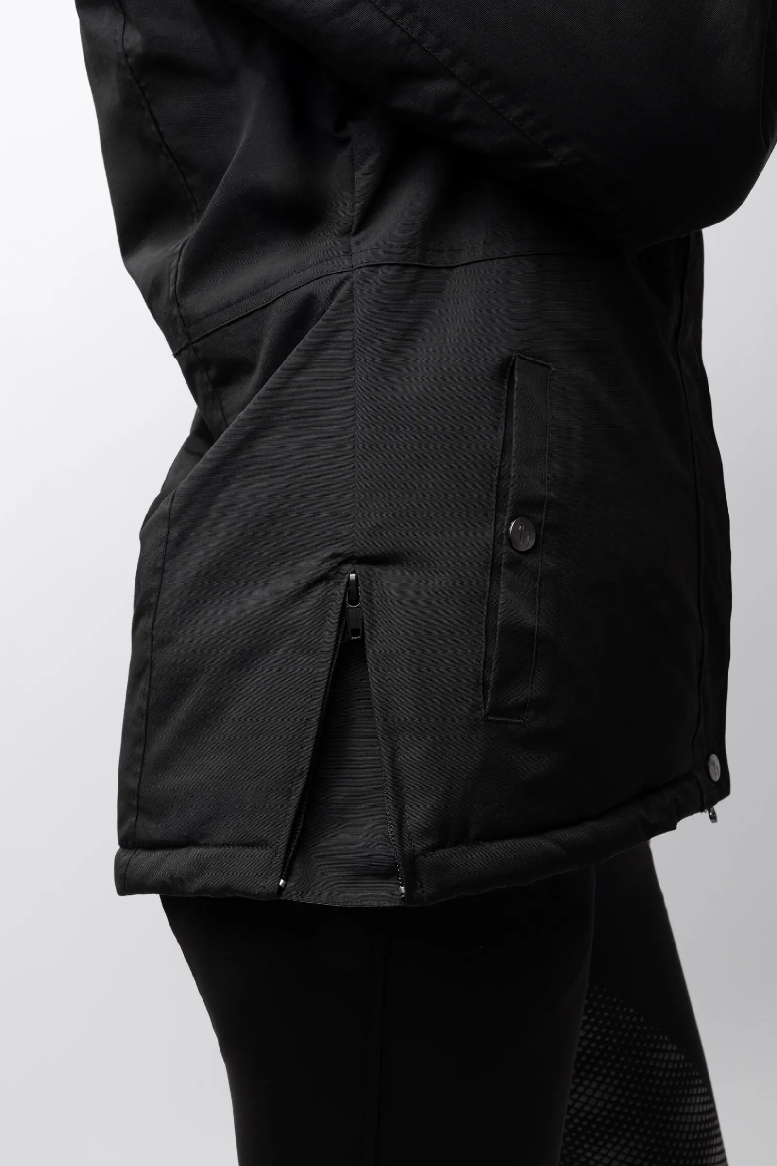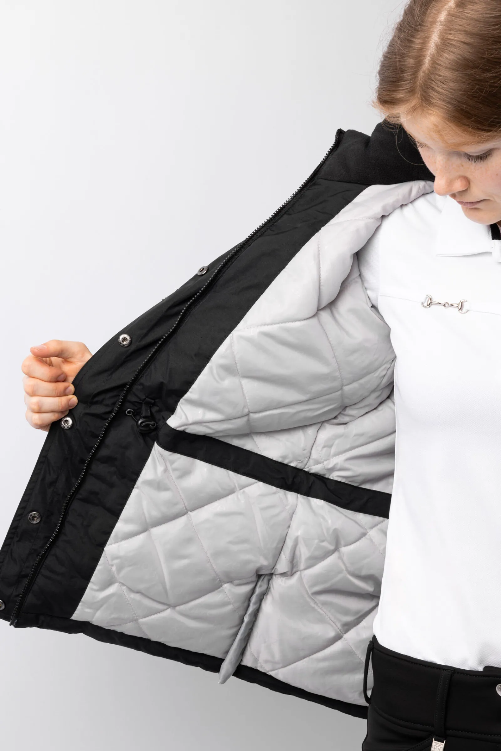 Horze Cheyenne vinterjakke er varmt polstret, perfekt når du skal ut og ri om vinteren.Stoffet er vannavvisende og vindtett.Sidesplitter med glidelås gir deg ideell bevegelsesfrihet.En stående krage og ribstoff på innsiden av ermene gir ekstra varme.Du kan fjerne hetten og justere nedre kant av jakken for en perfekt passform.Reflekterende tape på ermet gjør at du er synlig i mørket.Glidelåslommer holder eiendelene dine trygge og tørre.Bruk den med Cheyenne vinterridebukser (36283) for et varmt vinterutseende.