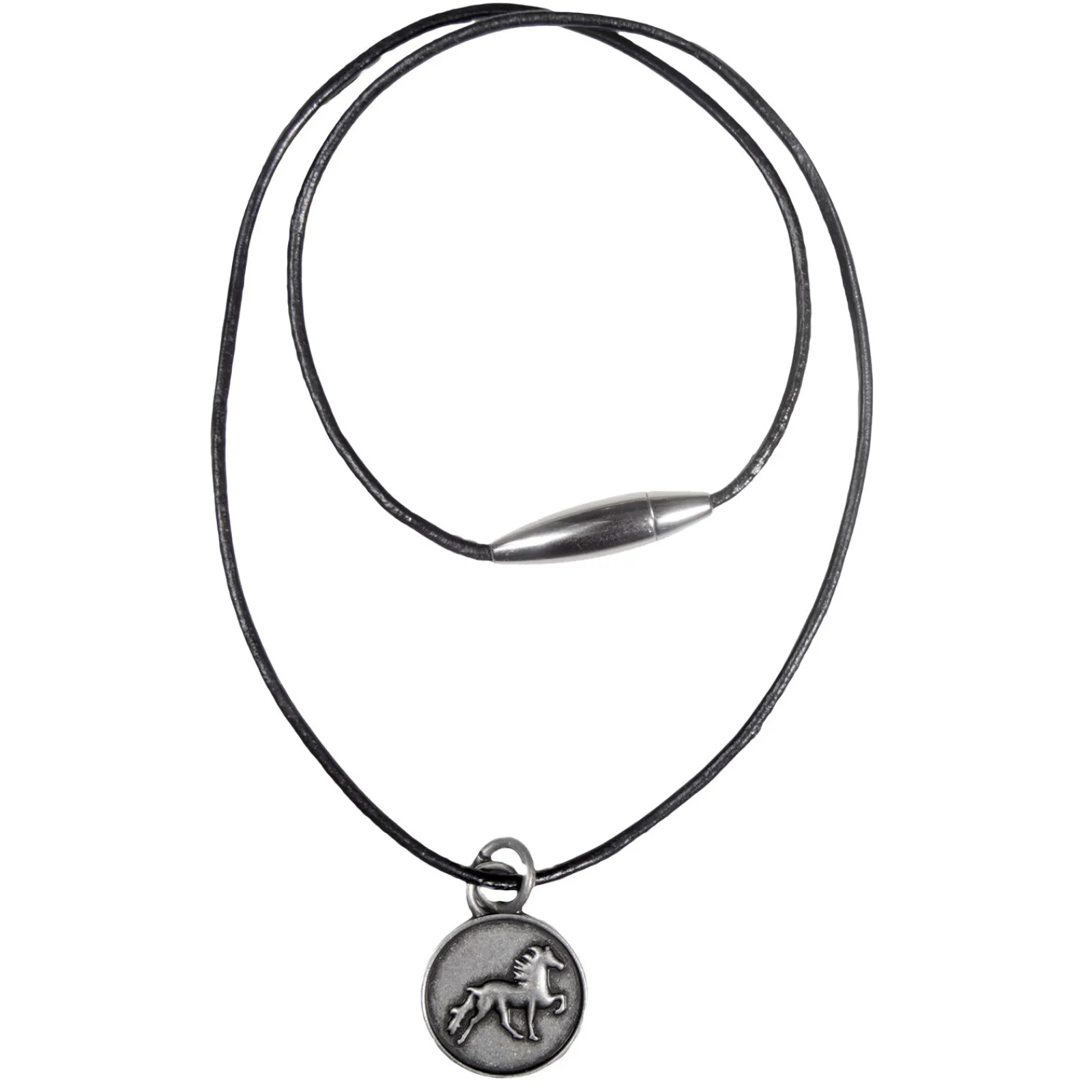 Lærhalsbånd av høy kvalitet med magnetisk lås, inkludert en rustikk island hest anheng. Leveres i liten gaveemballasje.