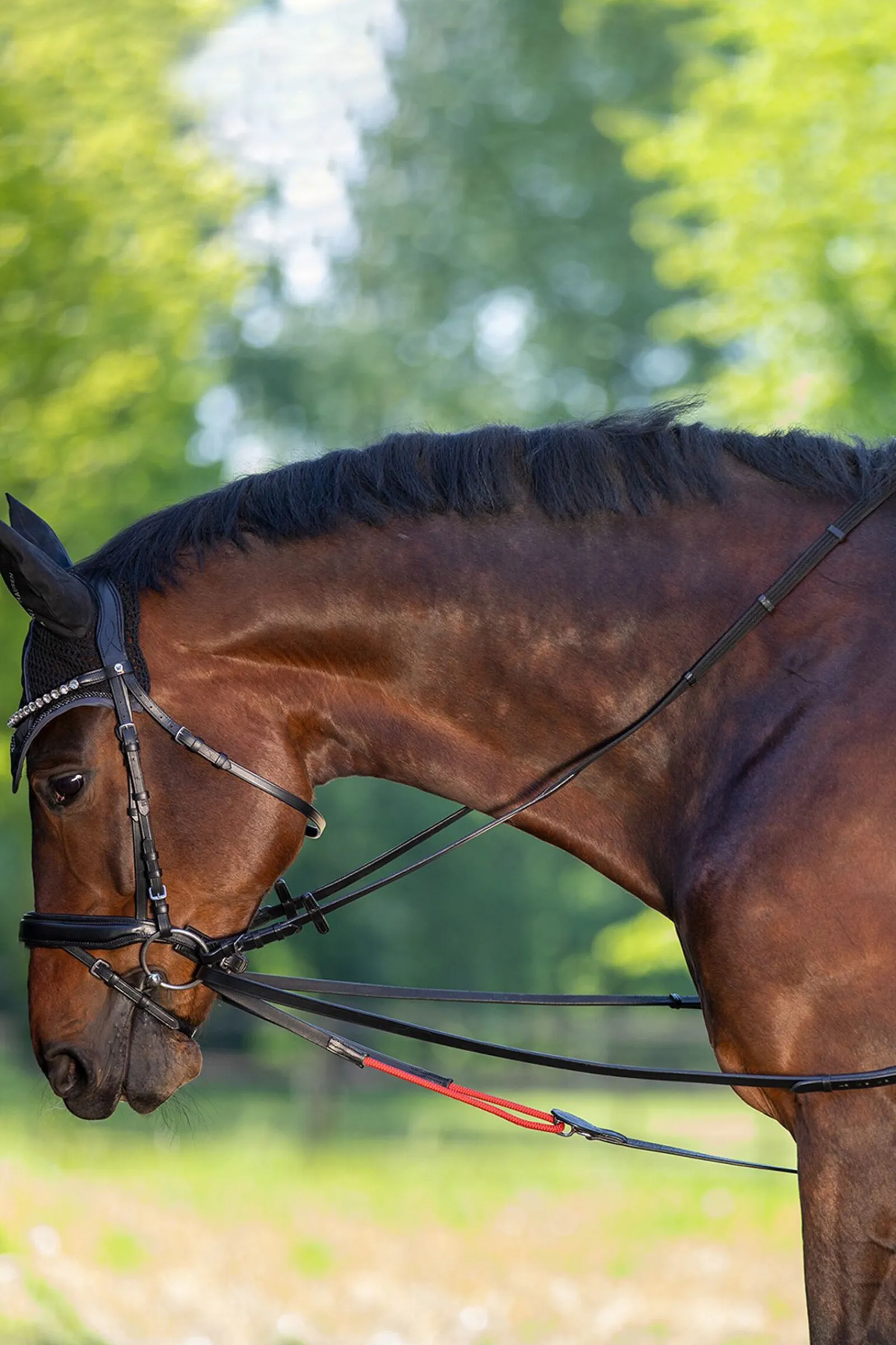 Innovative lengthadjustable and flexible leather draw reins for riding or lunging. The WtrainRein draw reins are attached to the girth or surcingle between the forelegs. A esecial rein runs through a guide roller and is taken from there through the reesective bit ring (from the inside to the outside) back to the girth or surcingle. The guide roller gives the reins and facilitates a gentle and mouthfriendly bending and suppling whilst riding or lunging.