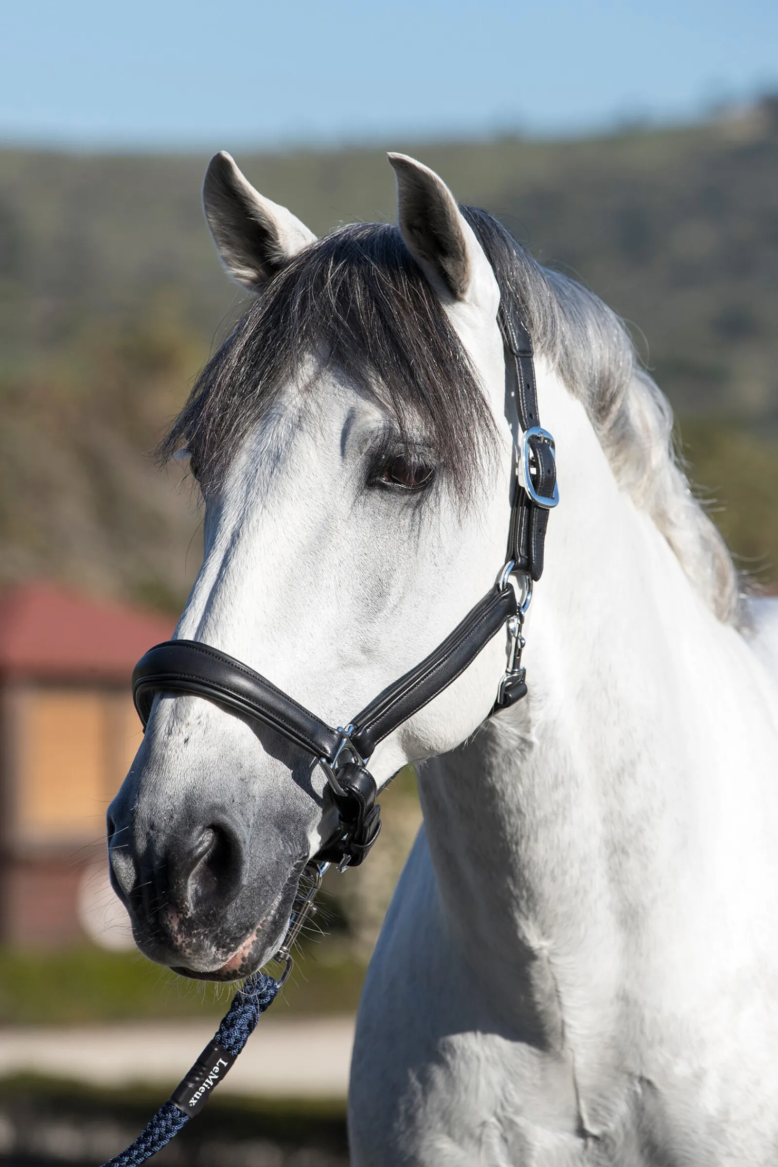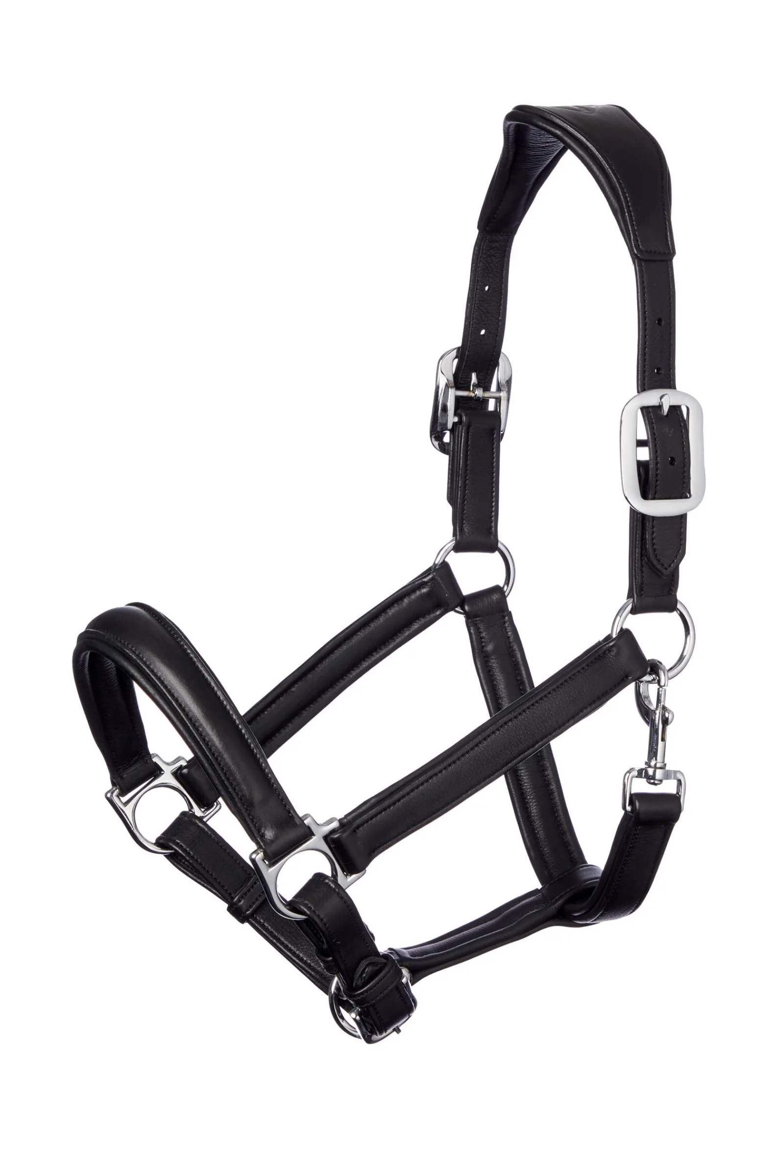 Dette vakkert utførte polstrede lærgrimet har et anatomisk formet hodepiece og nesebånd som gir full komfort til hesten. De solide metallbeslagene, polstret lærkehlriemen og kinnstykker gir et luksuriøst preg til denne klassiske grimma.
