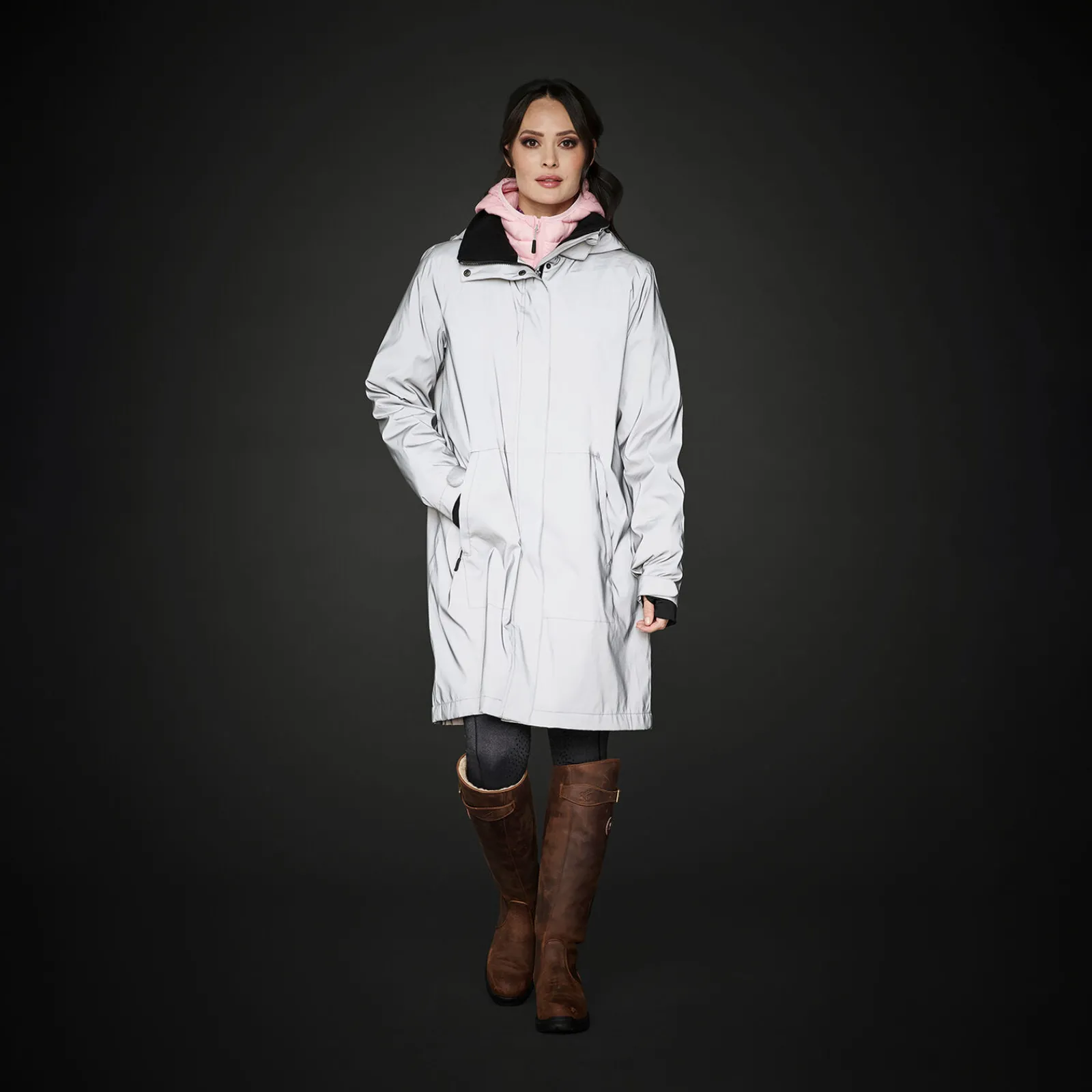Reflekterende parkas med mange ride-elementer.Bortsett fra synligheten på 360 grader er jakken også vann- og vindavvisende.Fôret med tynn, behagelig fleece som holder deg varm på kalde dager.Særlig på vinteren når det blir tidlig mørkt og synlighet blir en utfordring.Parkasen med det reflekterende stoffet sikrer maksimal synlighet i mørket.Toveis glidelås som enkelt kan justeres når du er på hesteryggen, akkurat som ridesplitten.I tillegg kan parkasen holdes på plass med justerbare beinsnorer.To romslige frontlommer som kan lukkes med glidelås.Hetten kan tas av, og er fôret med mesh.Innvendig mansjett er laget av elastisk stoff, og har tommelhull for å holde håndledd og hender varme.